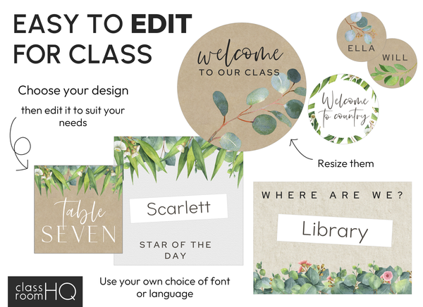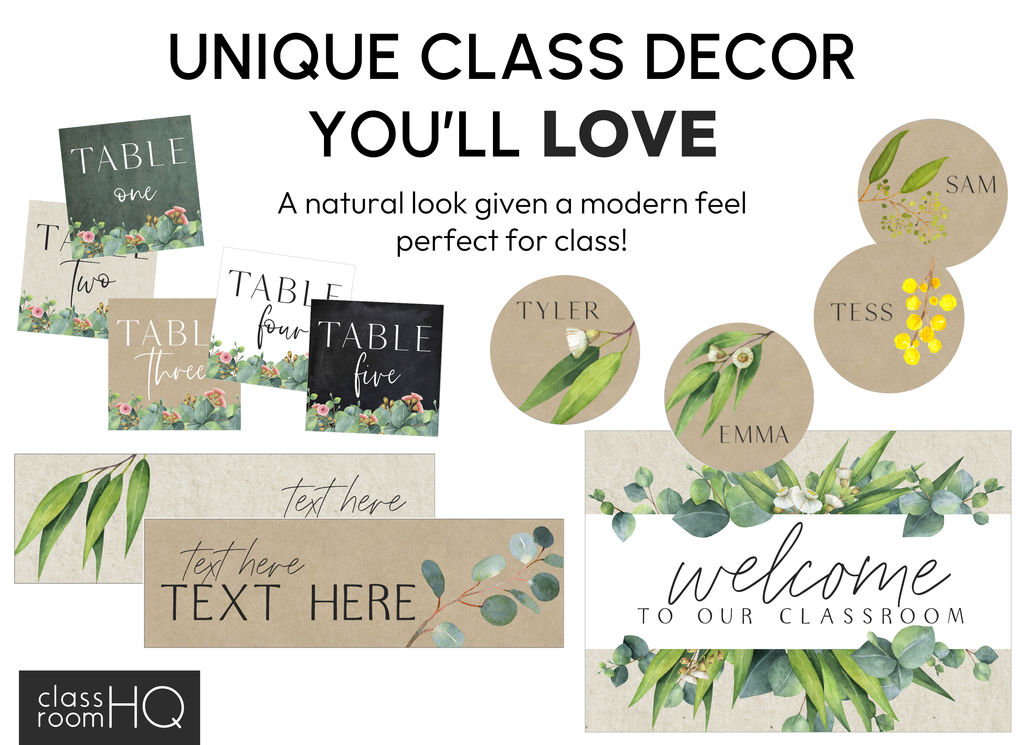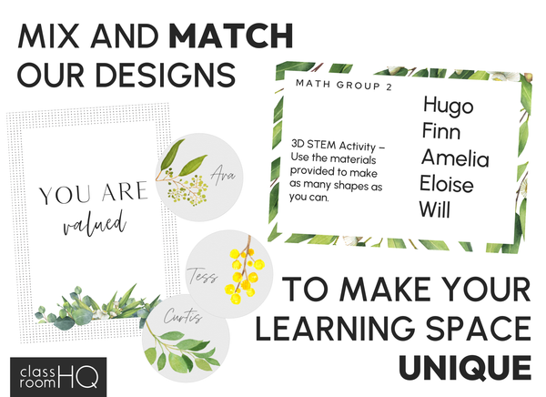 Modern Eucalyptus Design – calming and cohesive with soft greenery that suits any classroom decor style.