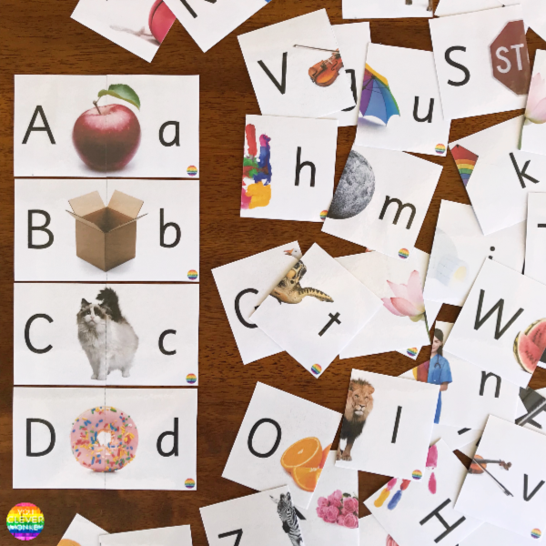 - 26 alphabet letter 2-part puzzles with both upper and lower case letters displayed together with real life full color photo with the same beginning sound