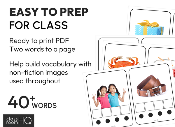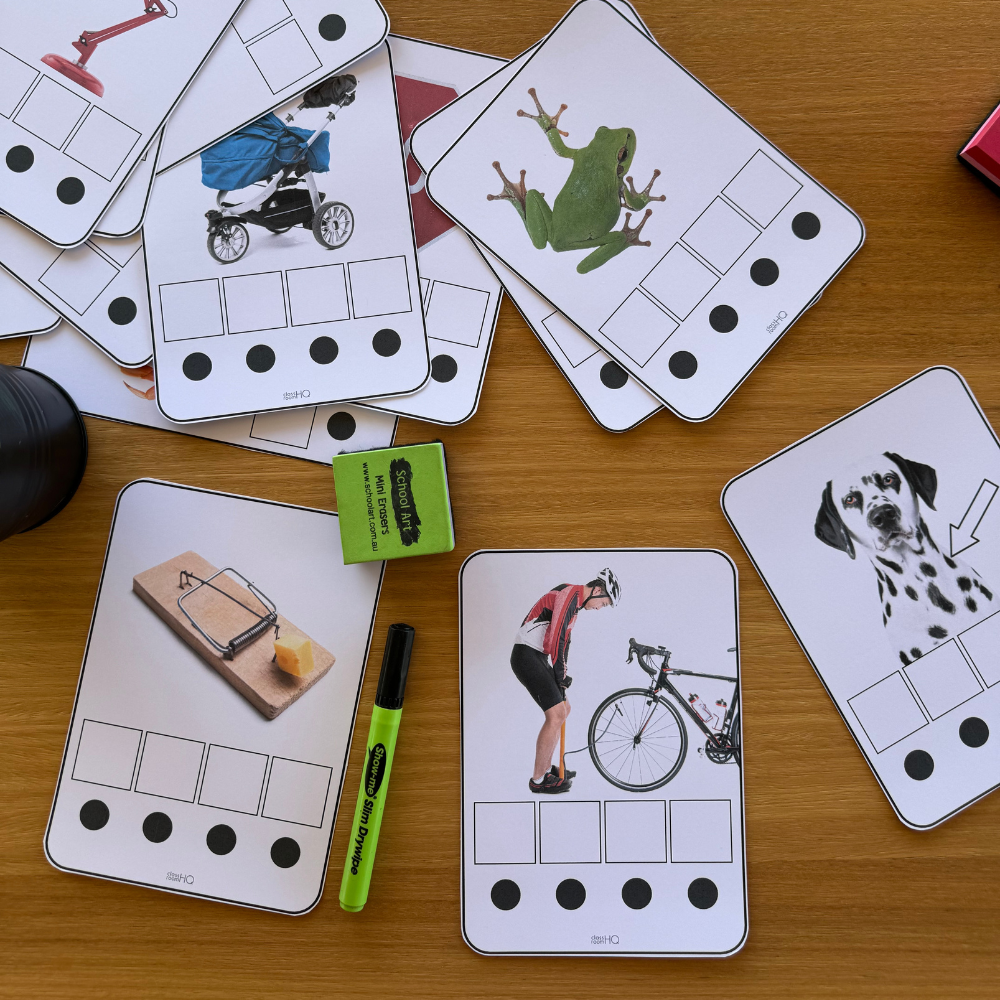 - 40+ cards with real life photo of a CCVC or CVCC word, four equal sized sound boxes and four dots to tap to map out the sounds