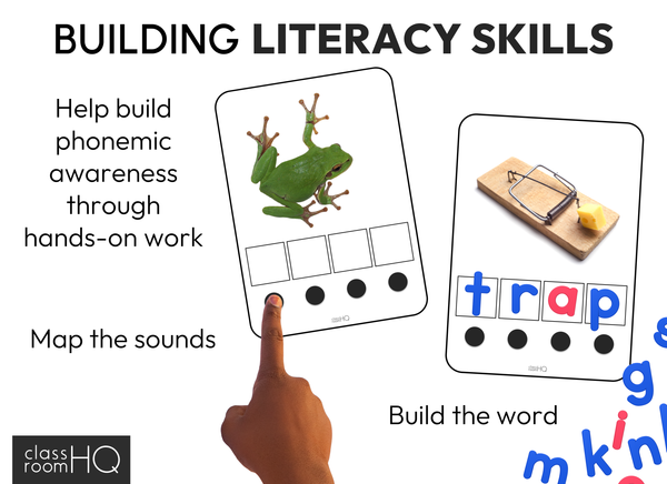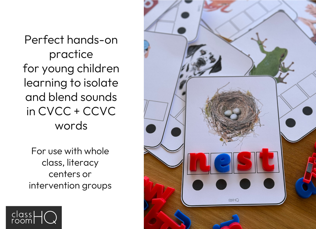 Using sound boxes will help your students build their phonological awareness skills. They will help students identify the individual sounds making it easier for them to spell and read both CCVC and CVCC words correctly.