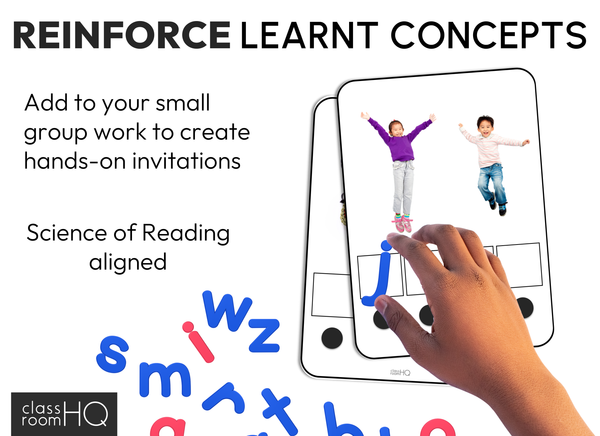 Ask your students to tap a dot under each sound box as they say each sound when they say and stretch out the word. Then using magnetic letters or letter tiles, have them build the word. Once they have built the CCVC or CVCC word encourage them to slide their finger across the card to read the word helping them to build their decoding skills.