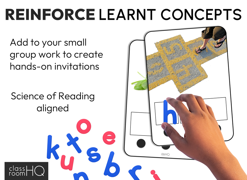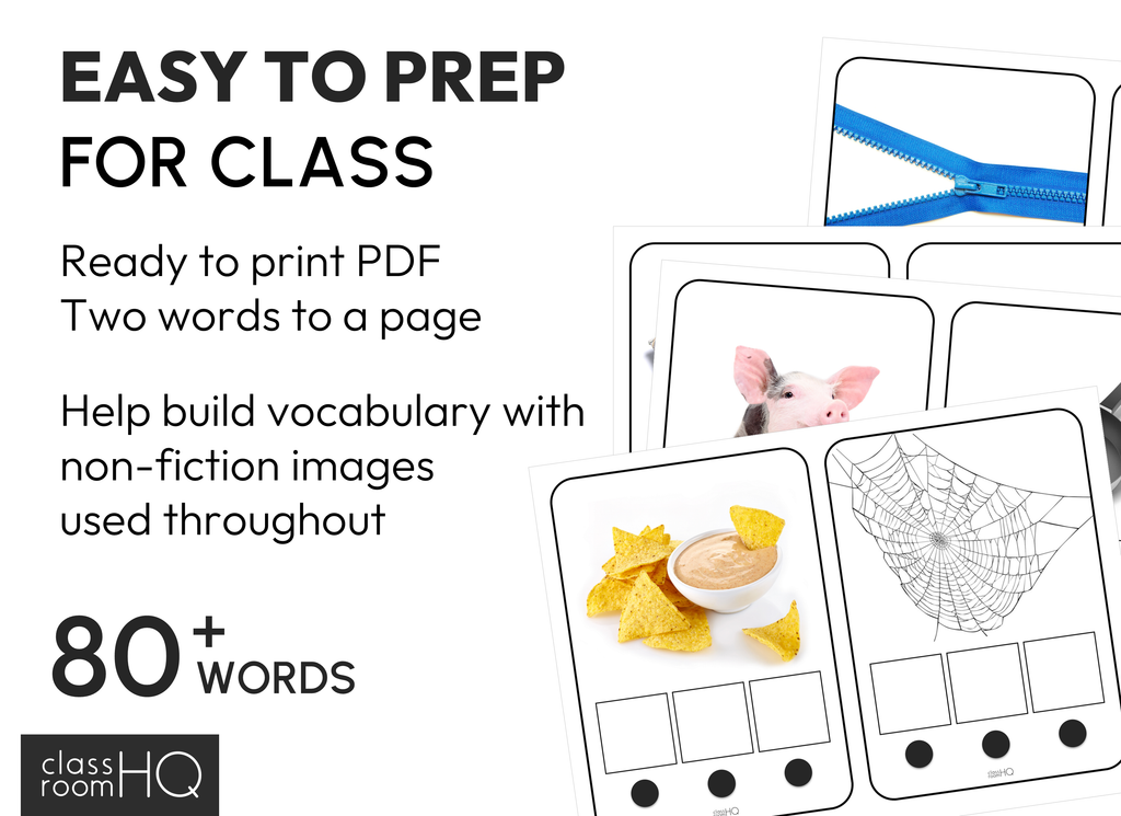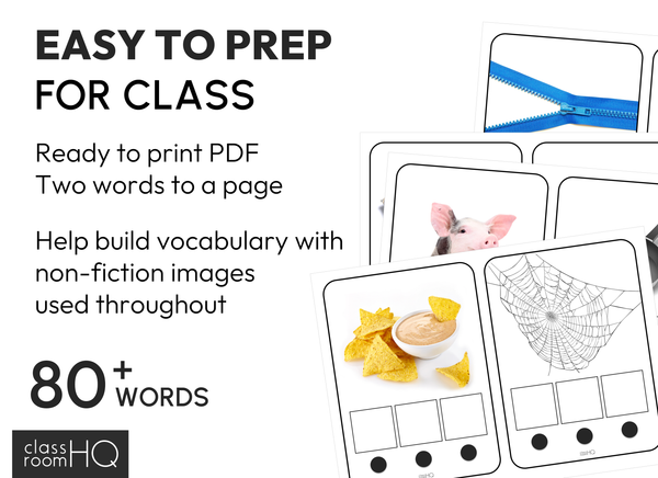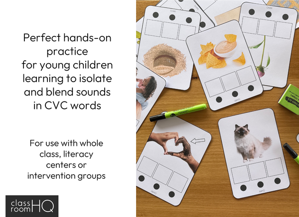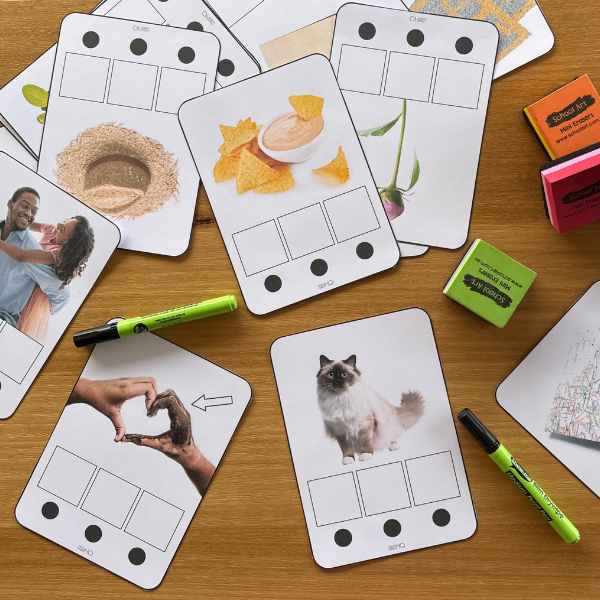 • 80+ cards with real life photo of a CVC (consonant-vowel-consonant) word, three equal sized sound boxes and three dots to tap