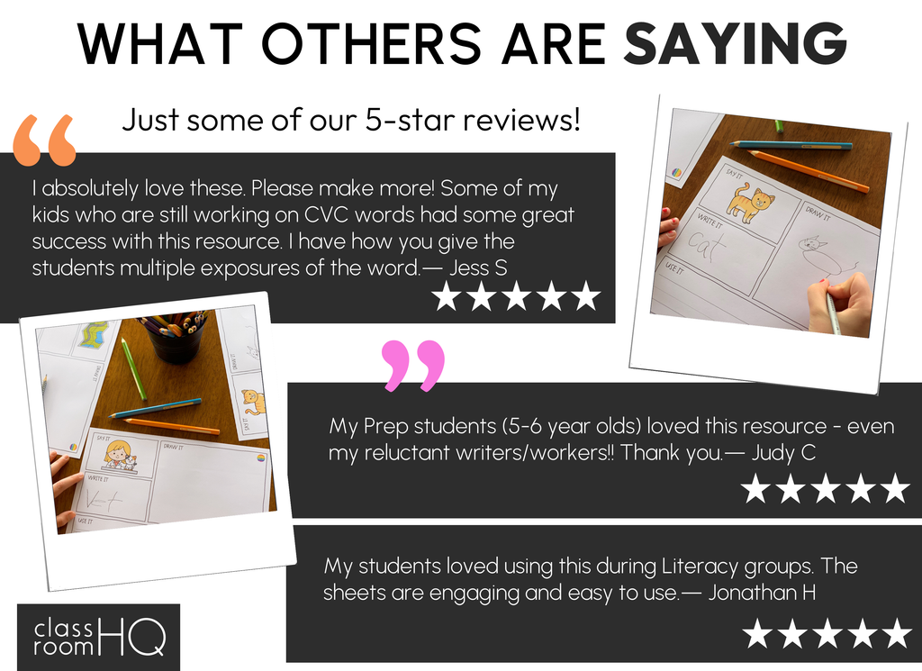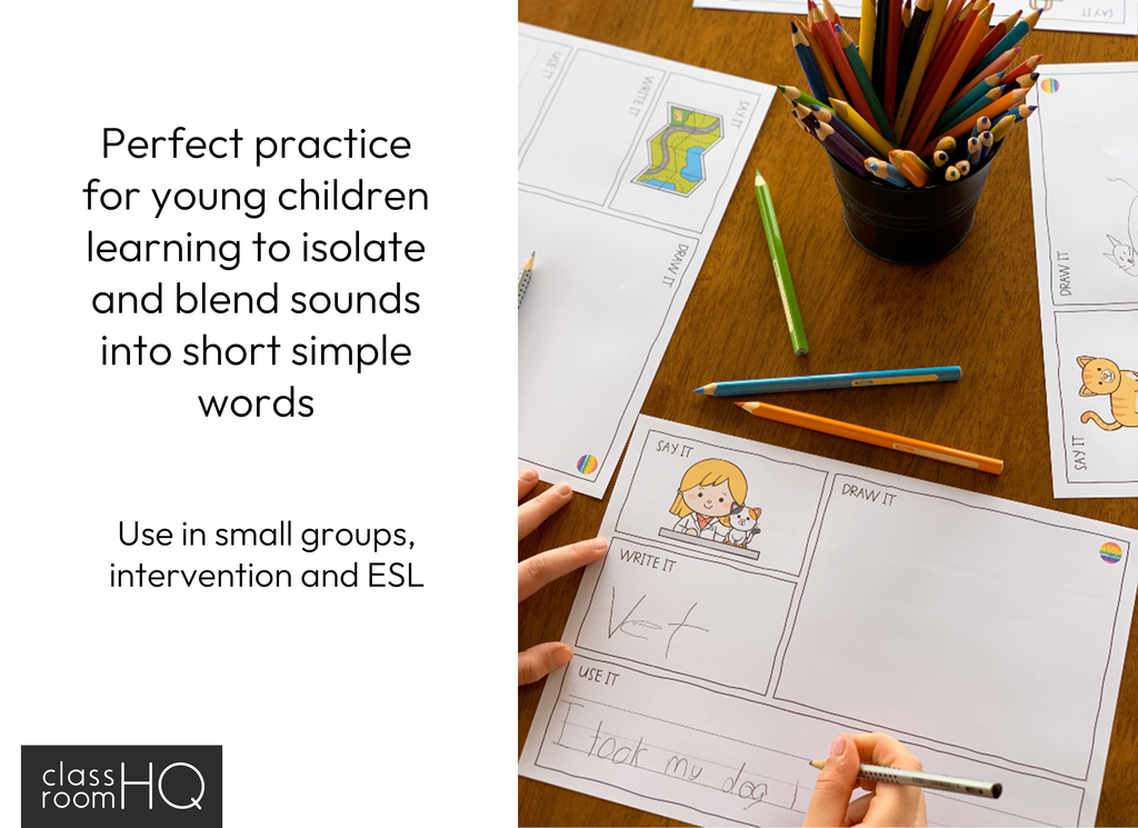 Each mat provides a picture clue of the targeted CVC word for children to practice. After saying the word aloud, students are prompted to write the word then 'use it' by writing a short sentence and 'draw it' by either illustrating their sentence or just drawing a version of the word themselves.