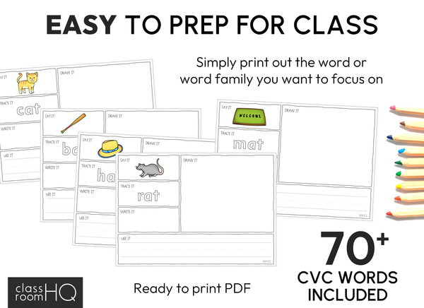 • 75+ mats with clip art illustration of different CVC words as a visual and prompts to 'write it', 'use it' and 'draw it' - 1 per page