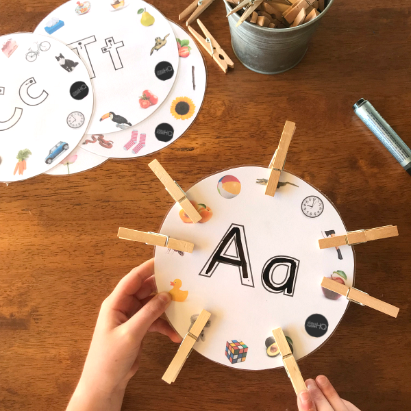 Add some clothes pegs to help build fine motor skills or counters to mark the correct sound.