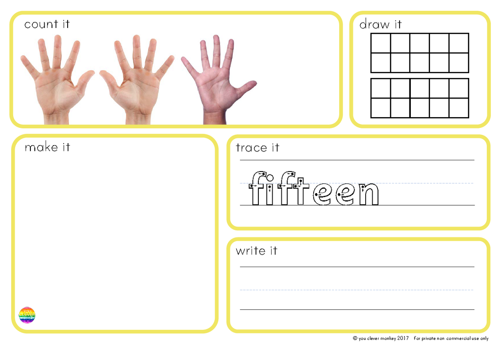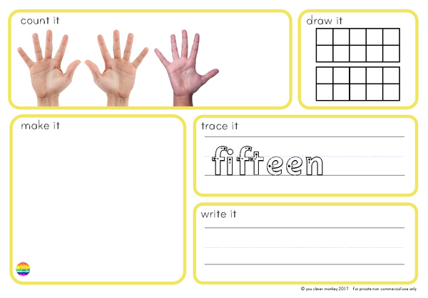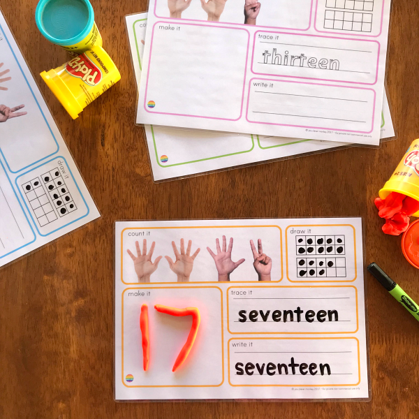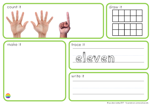 - 10 full page mats for each number from 11-20 with space and prompts provided for children to practice the different representations plus number word to trace - 1 per A4 page