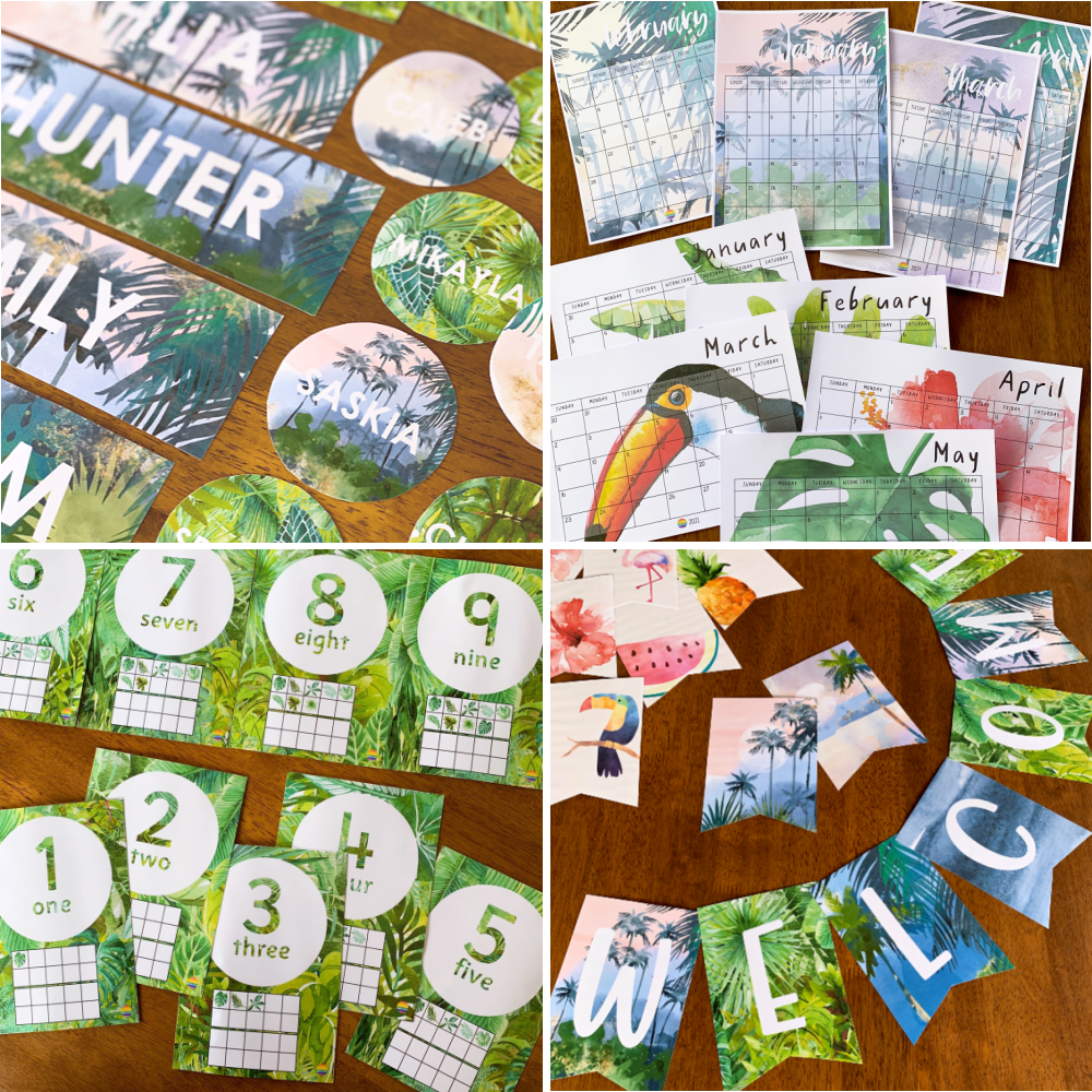 Bring a sense of calm to your classroom with these stunning educational printables 💚 Lush tropical leaves, beach sunset skies and fun animals - everyone will love coming to class!
