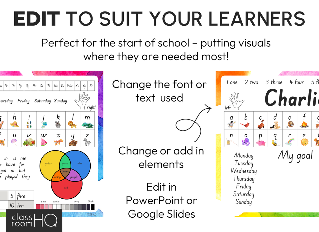 Our editable files allow you to change and customize the text so you can make it exactly what you want to fit your classroom. Simply type into the text boxes provided or add in your own to edit.