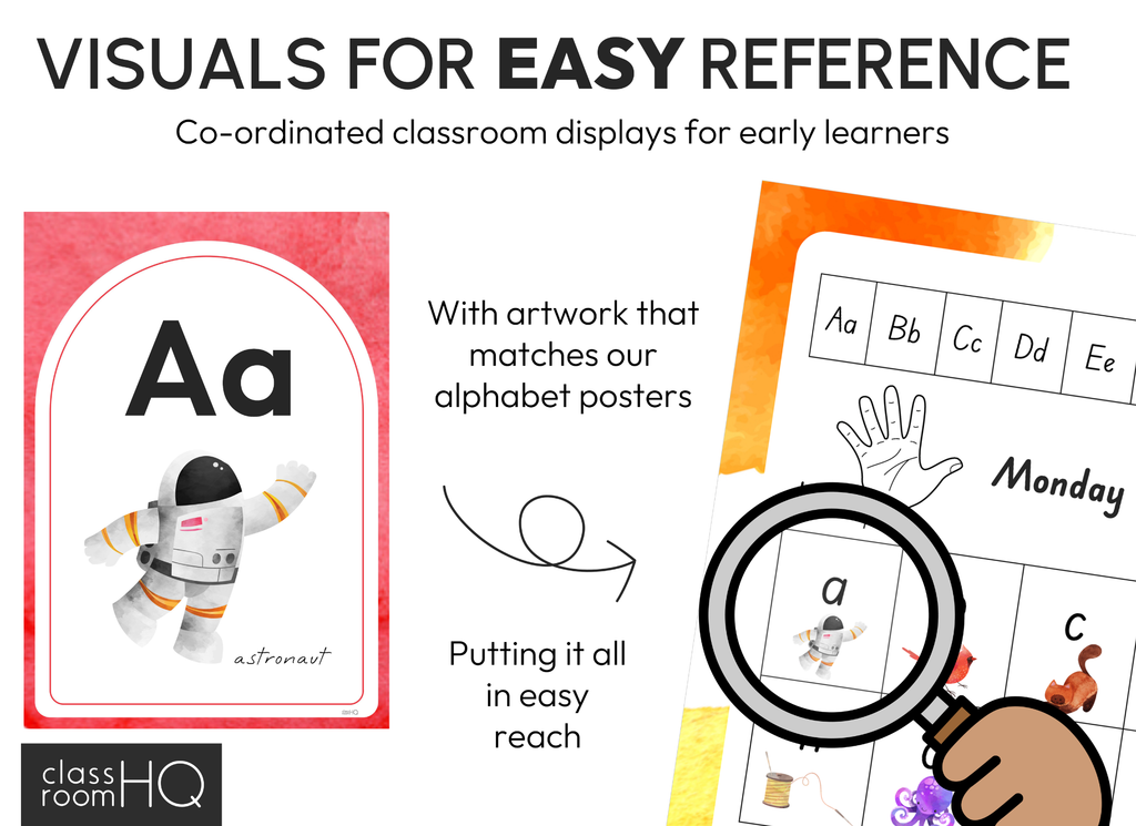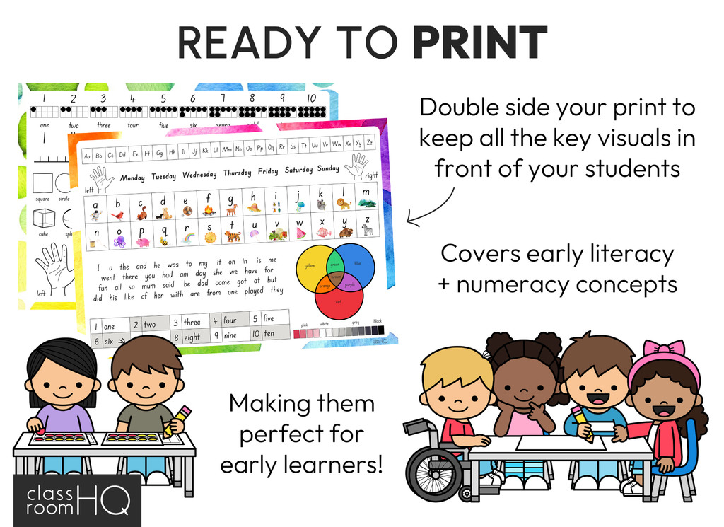 Each desk mat includes clear, age-appropriate visuals such as alphabet strips, phonics support, number references, days of the week, left and right reminders, shapes, colours, and time concepts. The soft watercolour accents create an inviting look that complements rainbow, pastel, and neutral classroom decor themes without overwhelming young learners.
