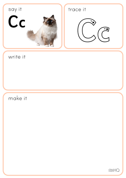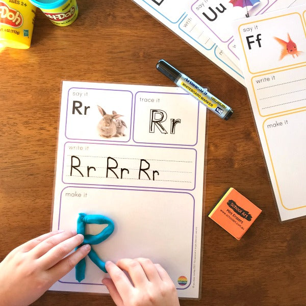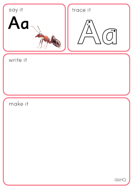 With a mat for every letter of the alphabet, both upper and lower case letter on the A4 page. Children are prompted to say the sound the letter makes -'A is for ant' then trace the outline of both upper and lower case letters using just their finger or laminate each circle and use whiteboard markers to trace the letters following the correct formation arrows.