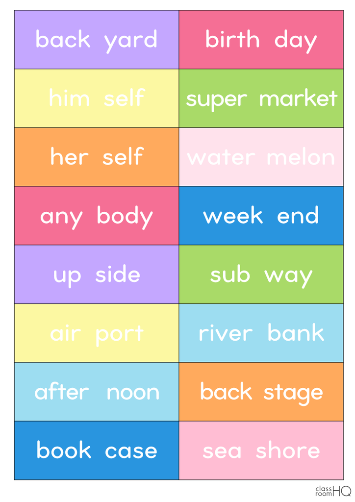 Compound words are when two or more words combine to form a new word that acts as a single word with its own distinct meaning that is different from the meanings of the words they’re made up of. Learning about compound words can be a fun way to build vocabulary.