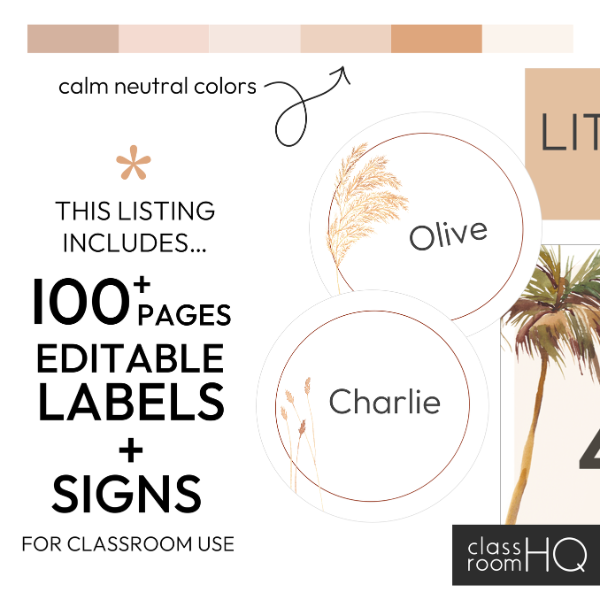 These desert inspired designs with soft earthy palm trees, modern boho artwork and earthy neutral colors will make your heart happy and help bring a beachy boho vibe to you classroom you and your children will love  🤍
