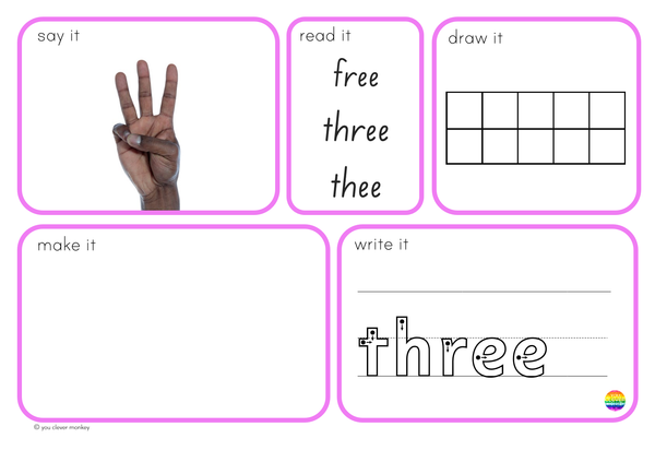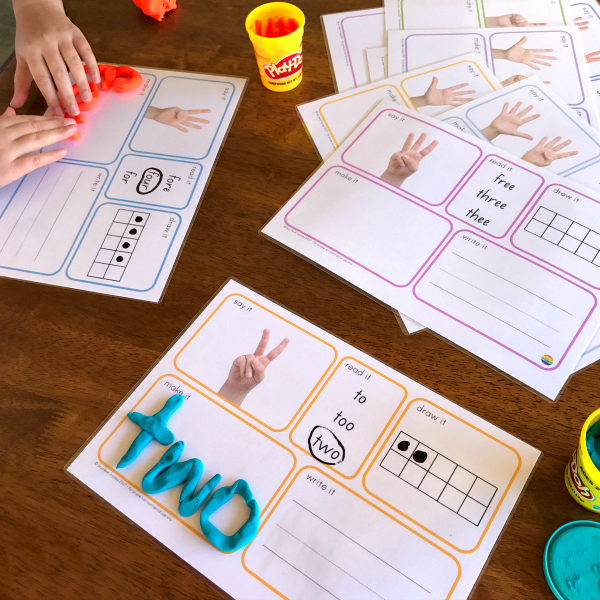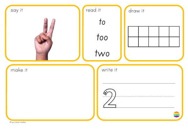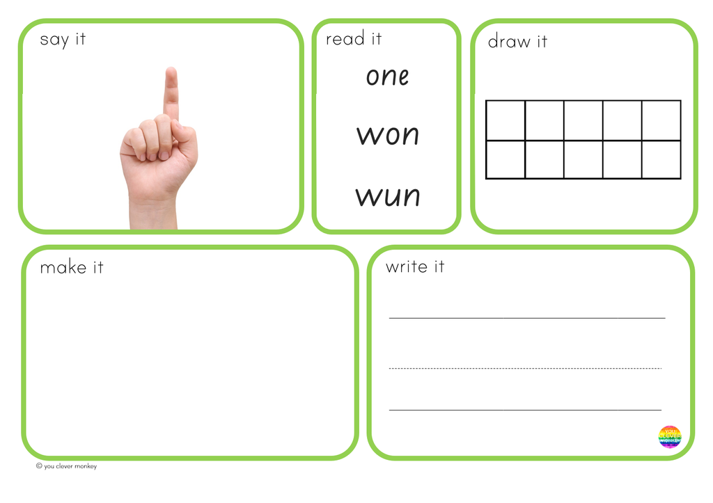 Children are then invited to read the correct word to match the number, draw the amount in the blank ten frame along with make it using playdough, wix stix or other small objects and then write the number or word.