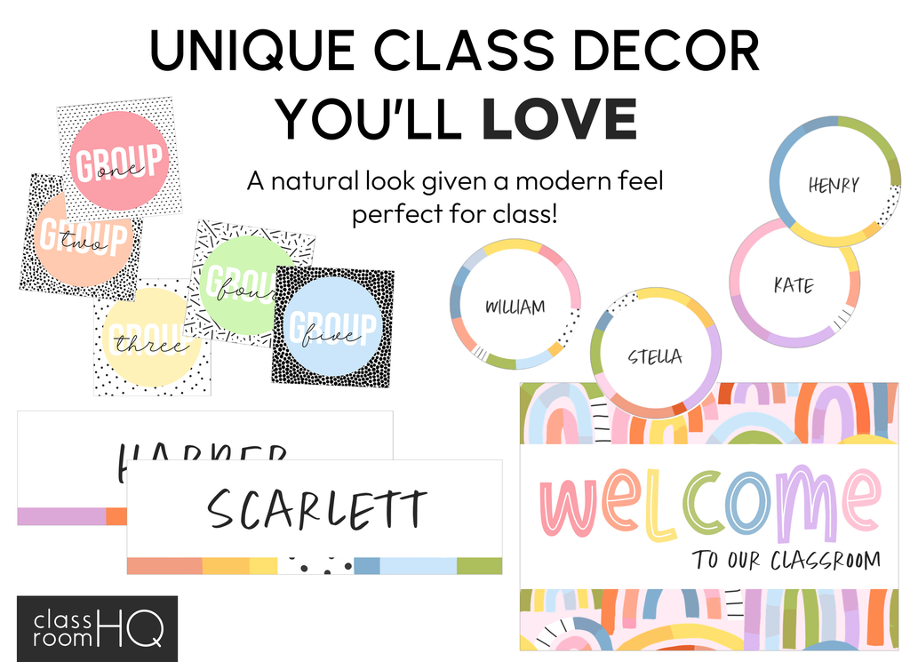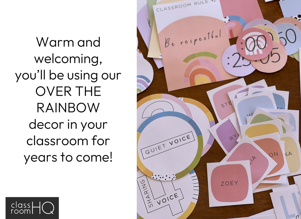 Everyone loves a rainbow classroom theme! Our OVER THE RAINBOW classroom labels pack gives this favorite classroom decor a fresh glowup with a rainbow mix of soft pastel colors, stylish black and white patterns and fun rainbow artwork with a modern feel!