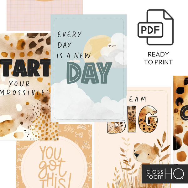 Motivational Posters (20 Designs+): A mix of wild animal prints, zoo animals and modern designs feature alongside an inspirational messages for classroom display.