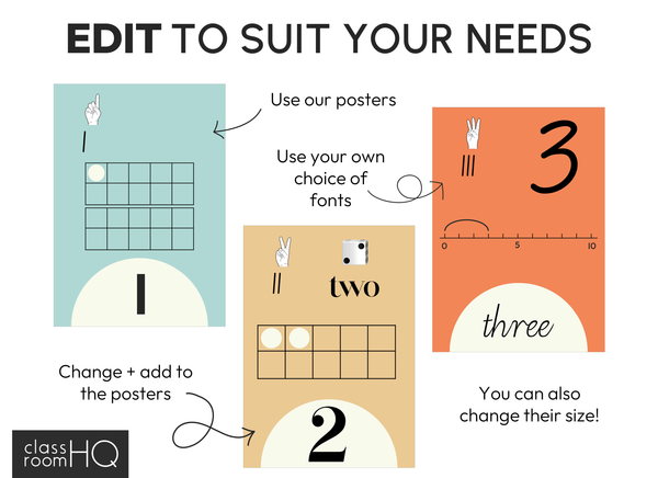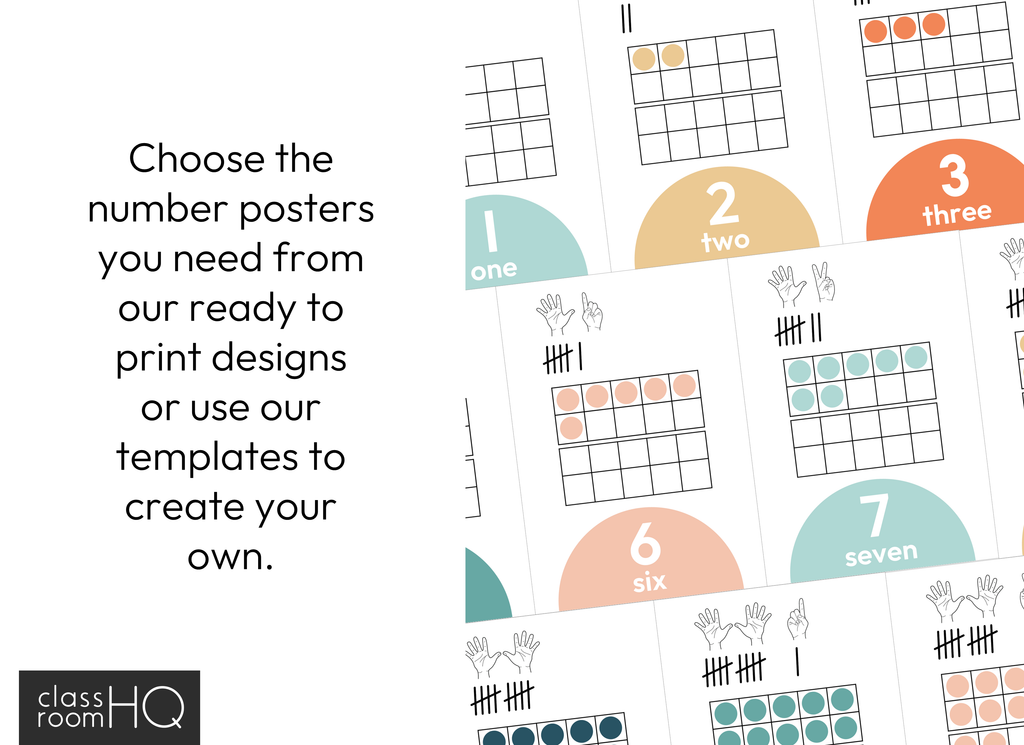 Choose from five different sets of number posters included from tracing number posters for prewriters to editable posters that can be used to create your own math displays - number lines, times tables, skip counting posters and more.