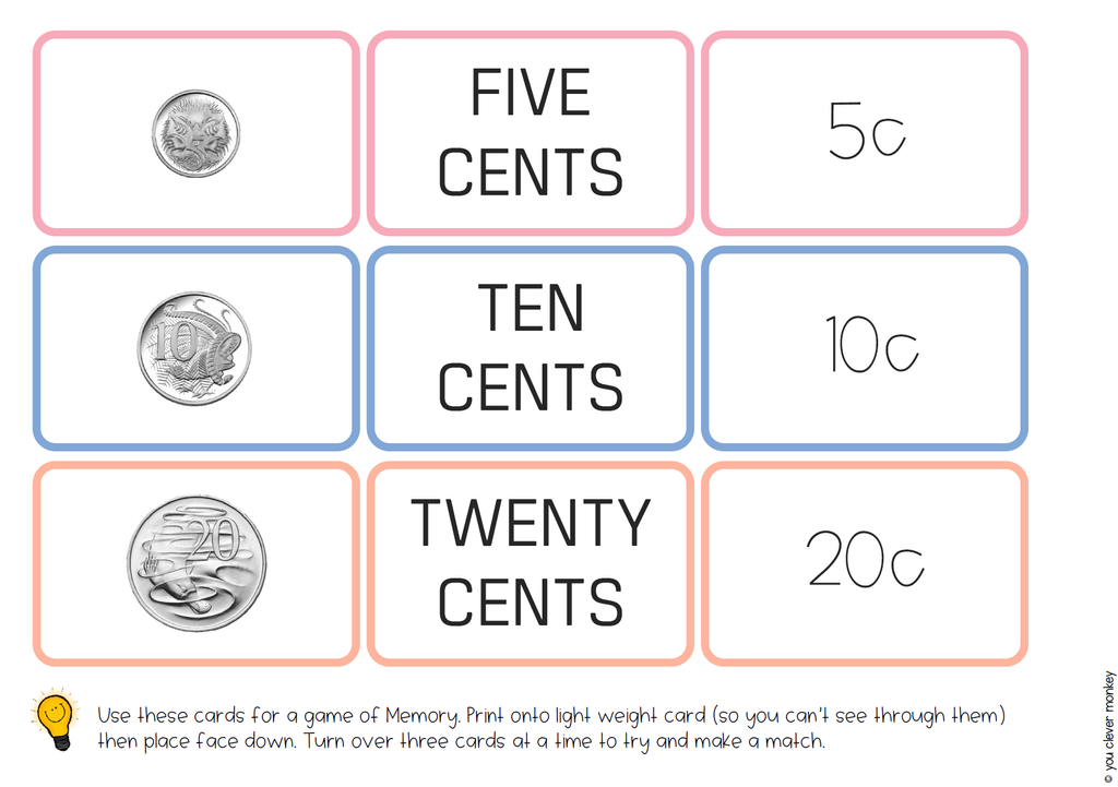 - Australian Coin 3 part Card Game - 6 cards per A4 page