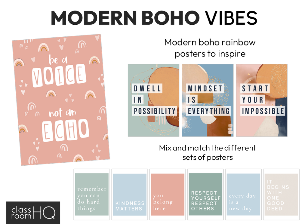 Bring positivity, encouragement, and calm style into your classroom with this set of Inspirational Growth Mindset Posters with a Modern Boho Rainbow Theme. Designed to motivate students while complementing your classroom décor, these posters feature uplifting quotes and affirmations in earthy tones and soft rainbow accents — the perfect balance of inspiration and modern design.
