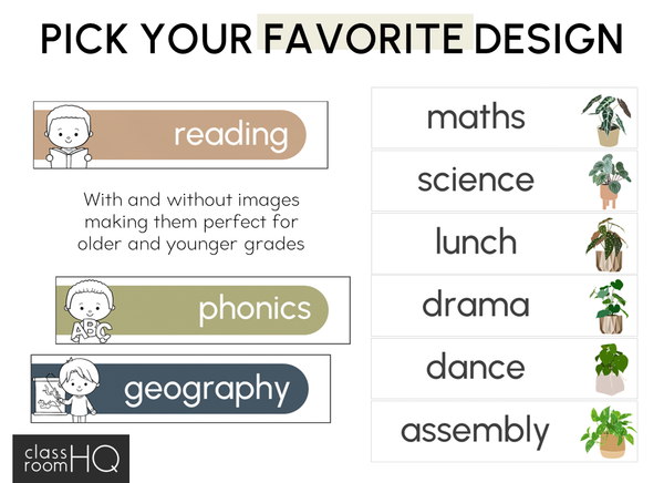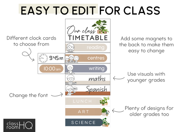 A classic colour palette and leafy green plant designs are brought together beautifully in this easy to edit classroom timetable pack. With modern indoor pot plant designs you'll love, choose from five different timetable all with easy to edit text to create your own classroom schedule to display in your classroom.