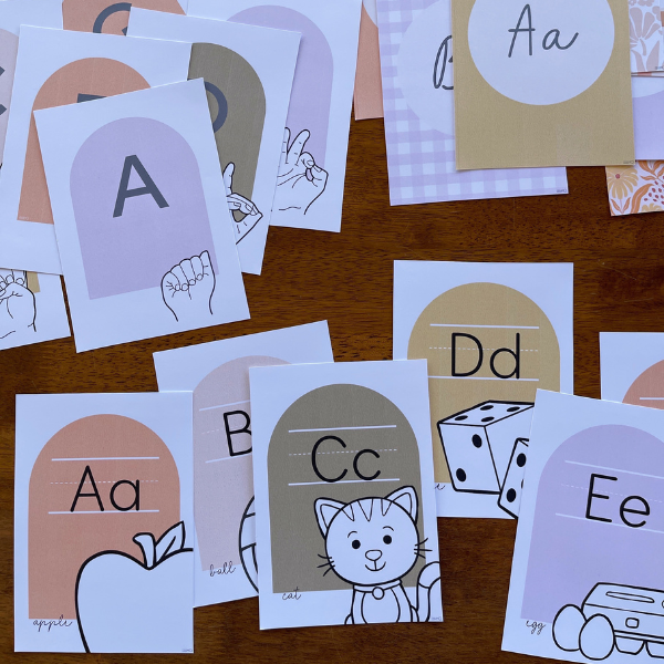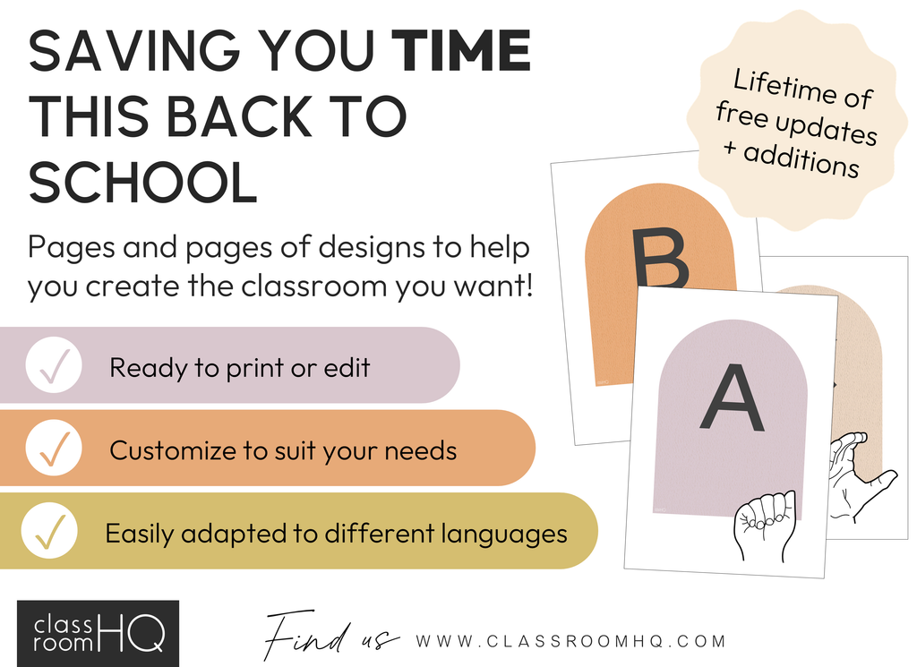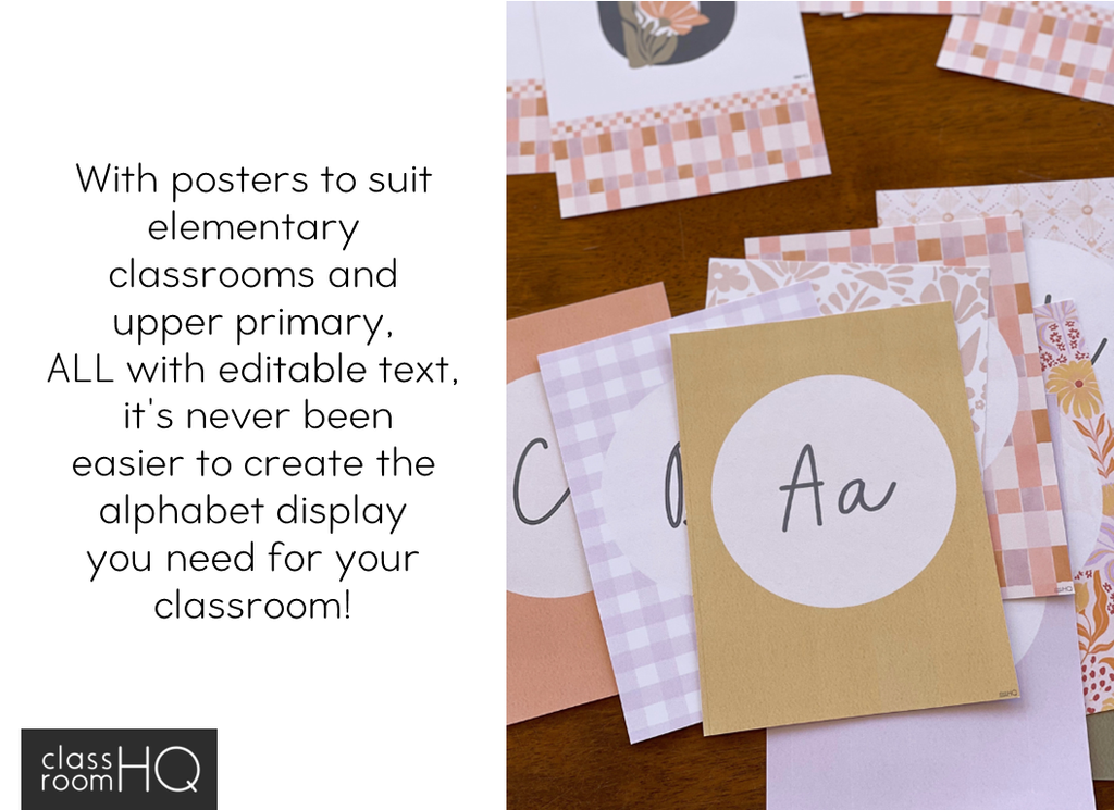 Choose from 7 different styles - simple cursive version, phonics based posters with a single image starting with the same sound, retro boho version as well as ASL and Auslan alphabet posters and a space saving smaller square version.