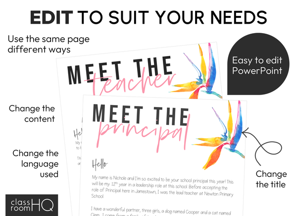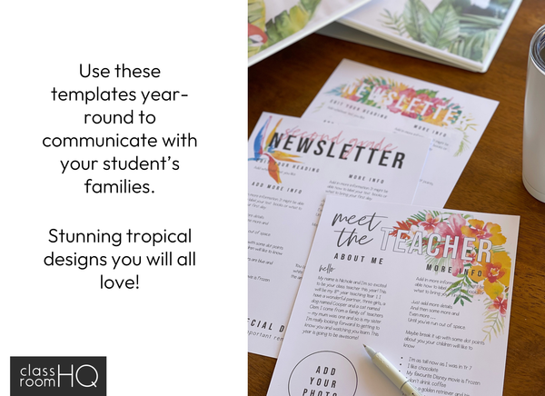 You can use this handy pack of tropical meet the teacher and classroom news templates to begin school and then throughout the year to communicate with your families this school year!