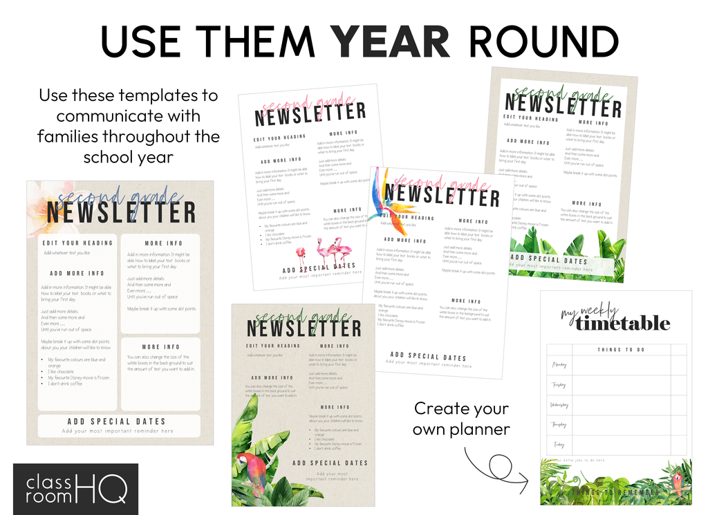 Easy to edit, you can use the tropical jungle newsletter templates throughout the year or print out the timetable pages for your teacher planner to keep yourself organized in style.