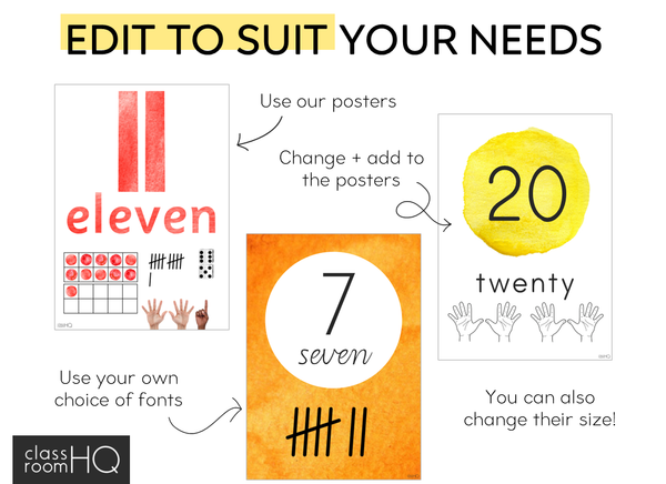 Many of these designs can be customized to suit your needs - perfect for teachers needing to use their own fonts or wanting to use another language as the text can be edited to from English as required making them ideal for bilingual classrooms. Edit the posters to add in dice, number lines, tally marks, Numicon or other math manipulatives you use in your classroom!