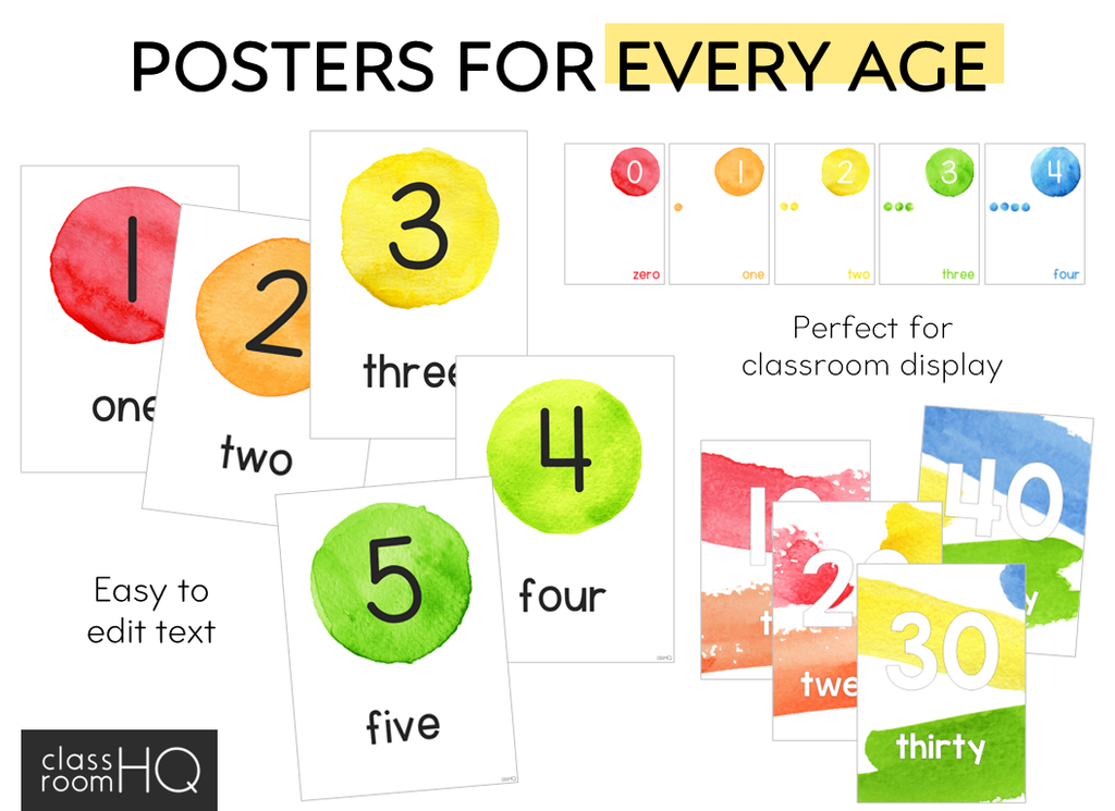• 0-30 editable number posters in rainbow order of paint colours includes numeral, number word and amount displayed as watercolour paint dots on white background - 1 per A4 page **please note for copyright reasons, only the text - numeral and word can be edited**