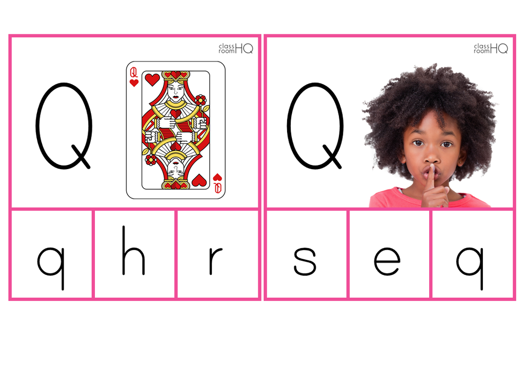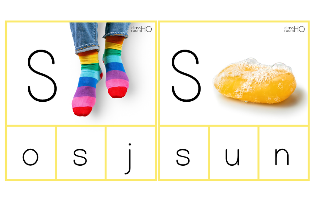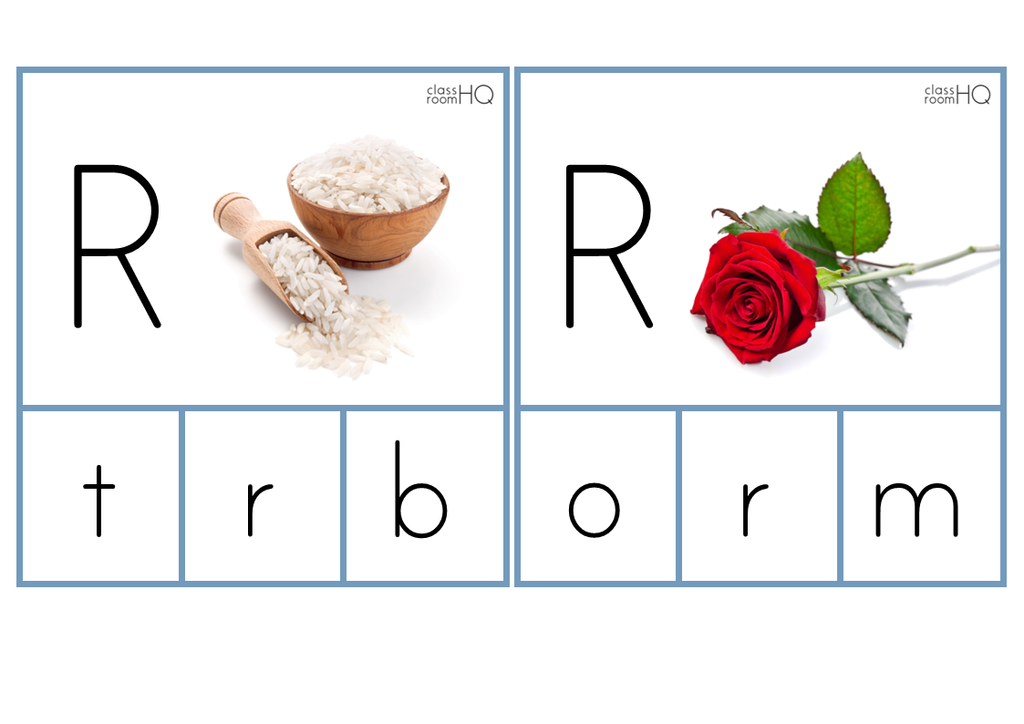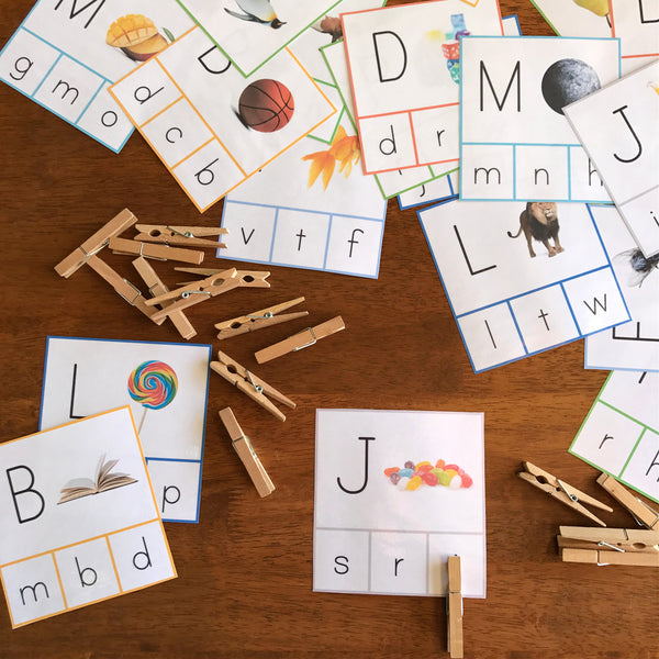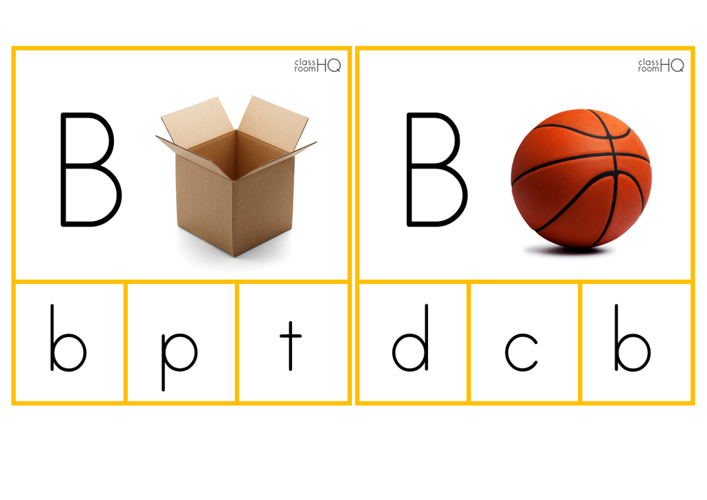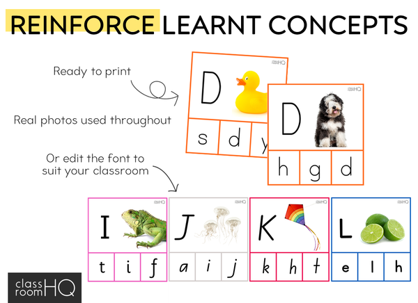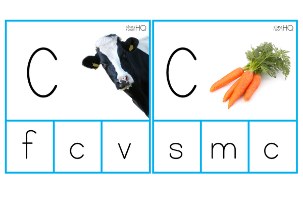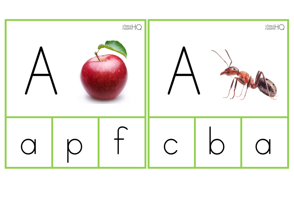 • 150+ different cards (multiple cards for every letter of the alphabet) displaying upper case letter, real life photo of something beginning with the same initial letter sound and three lower case letters to choose between and match - 2 cards per page