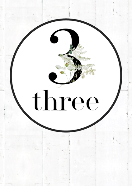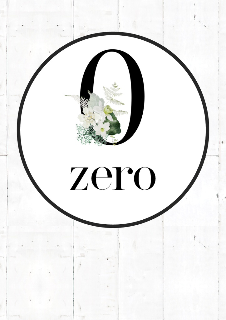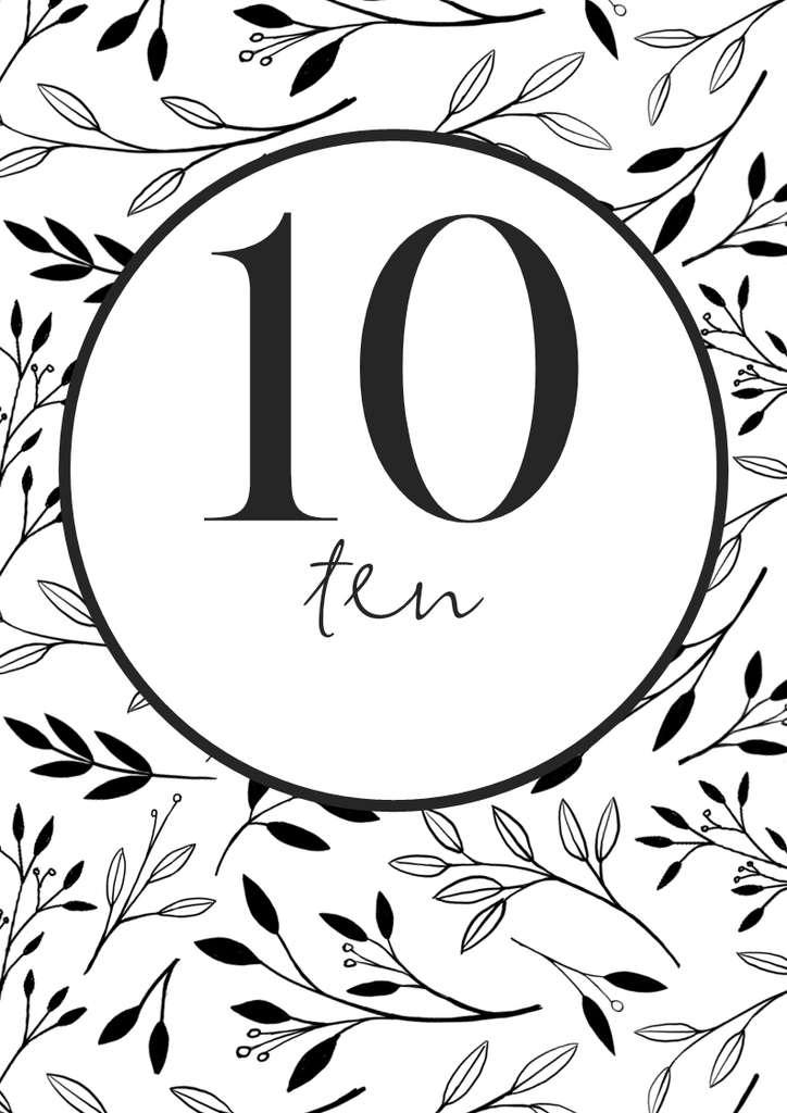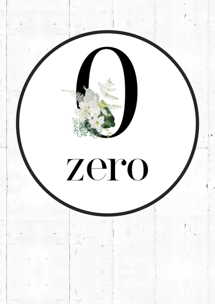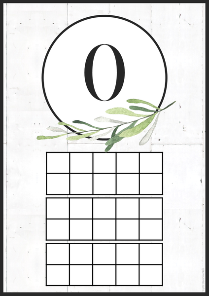 0-10 number posters (numeral and word displayed on white vintage metal background + leafy botanical watercolor artwork) 1 per A4 page