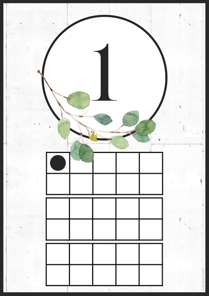 0-30 number posters (editable numbers) with numeral and amount displayed in 3 x ten frames with different leafy green botanicals on a vintage tin background - 1 per A4 page