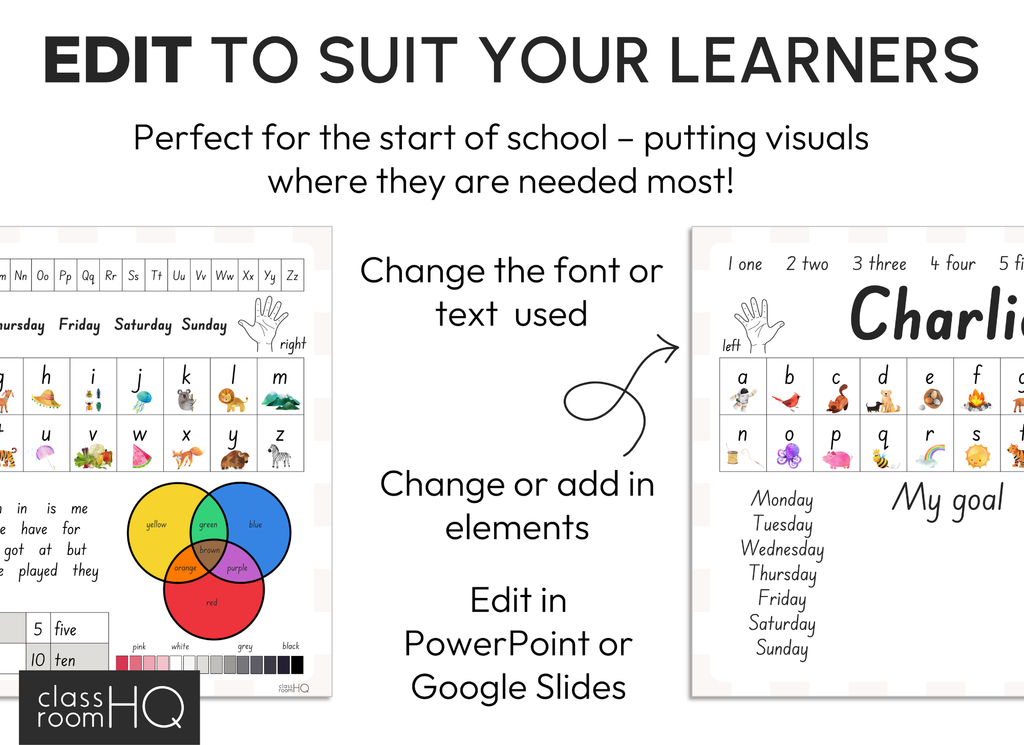Our editable files allow you to change and customize the text so you can make it exactly what you want to fit your classroom. Simply type into the text boxes provided or add in your own to edit.