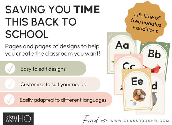 Our class door, alphabet posters, affirmations, number cards, and other classroom displays can easily be edited to suit your space while our versatile templates, signs, binder covers, calendars, timetables, and posters will make organizing your classroom materials and creating your learning centres easy while adding a touch of sophistication to your classroom with our vintage palette of yellows, greens, cremes and pink.
