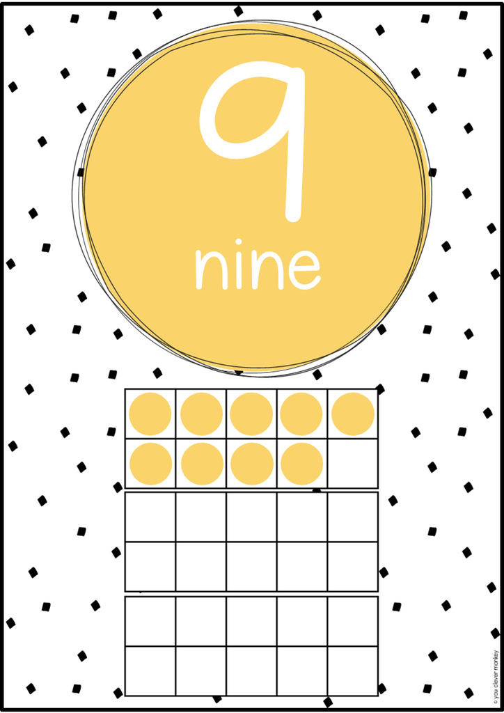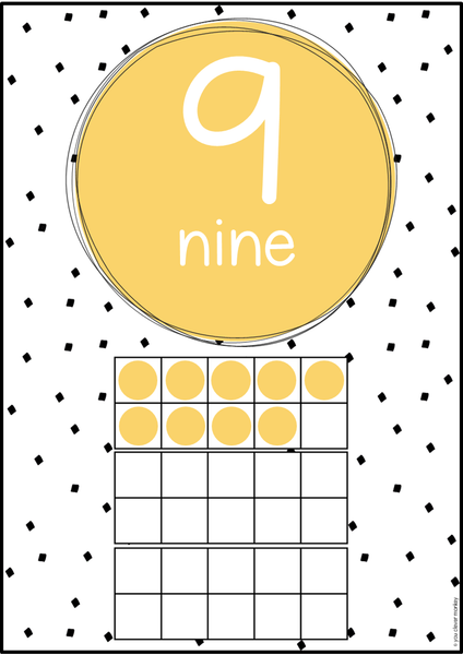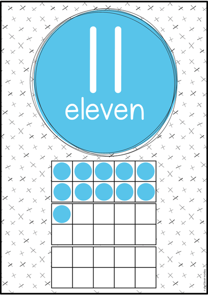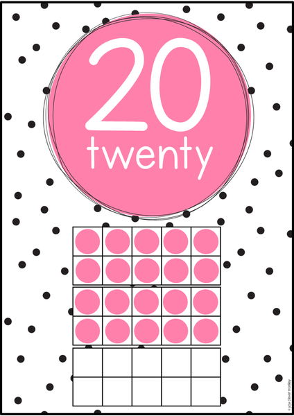 - 0-30 rectangular number posters with bright rainbow colored prints + numeral + number word and amount displayed on 3 x ten frames in different colors on white background - 1 per A4 page