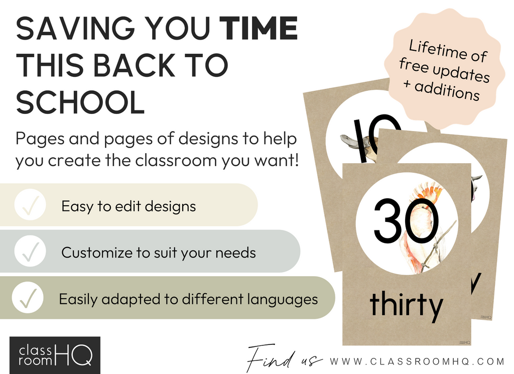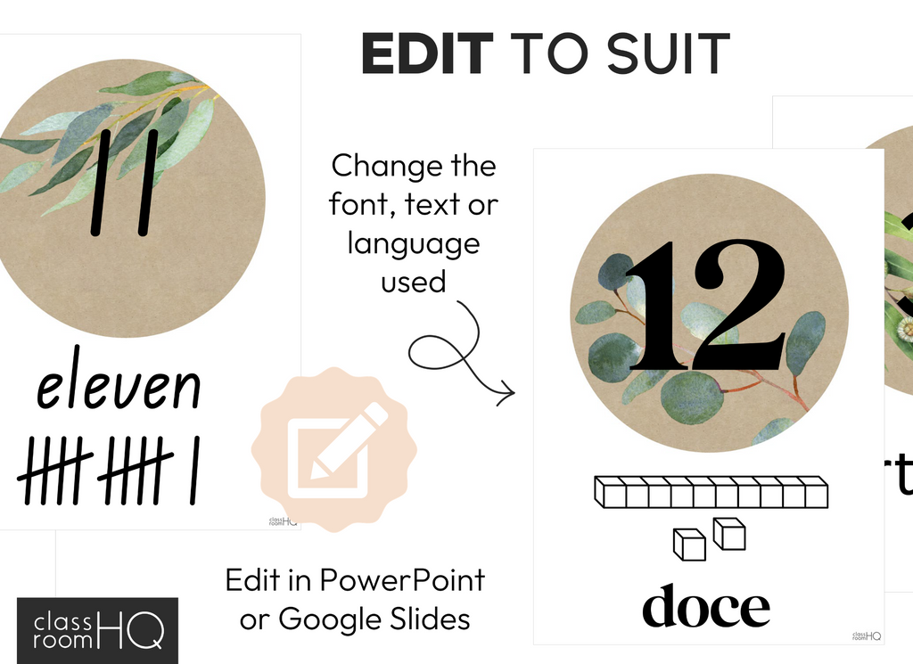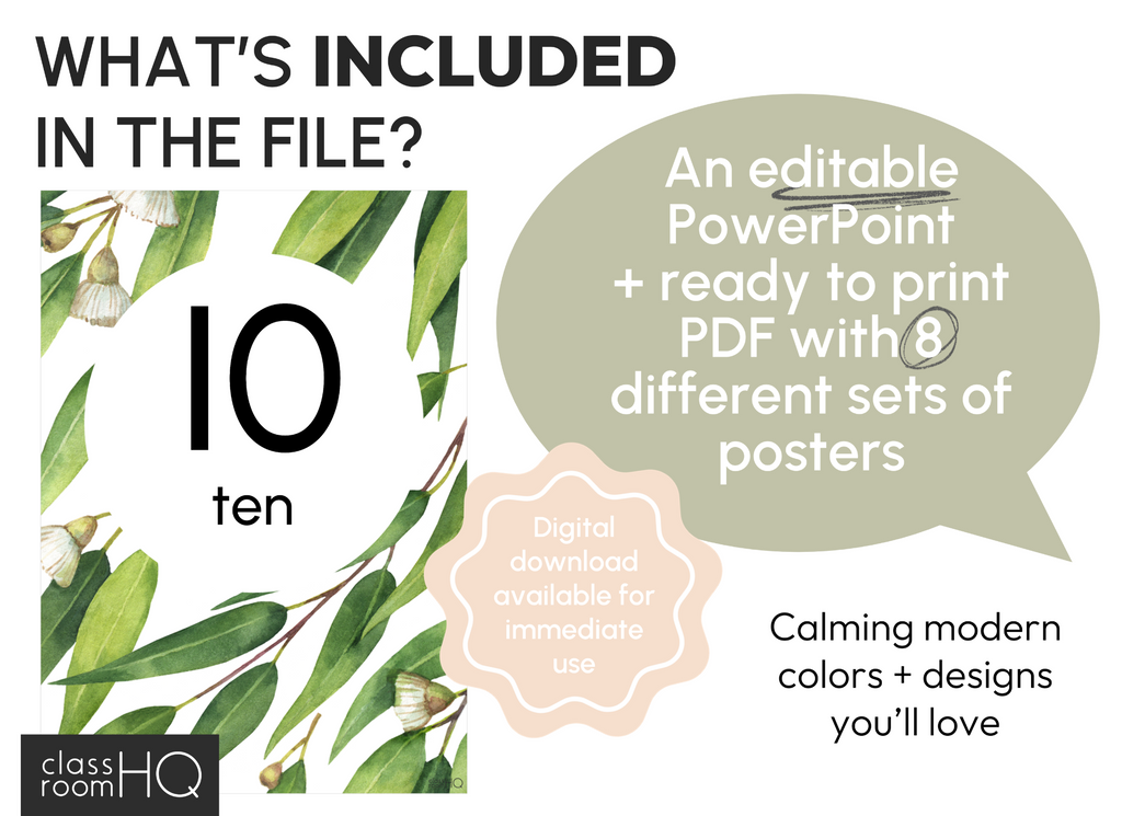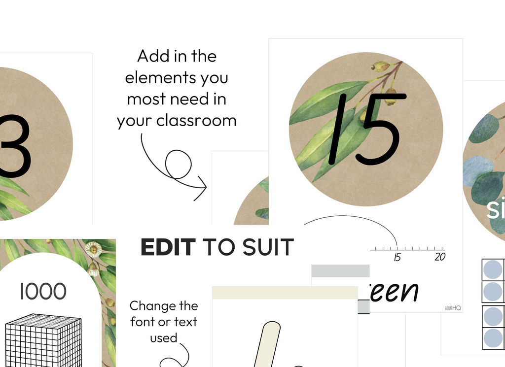 Make early numeracy visible, clear, and stylish with this set of Editable Number Posters featuring a modern Australian eucalyptus theme. Designed for Kindergarten-2 classrooms, these posters support number recognition, counting, and place value while creating a calm and cohesive math display.