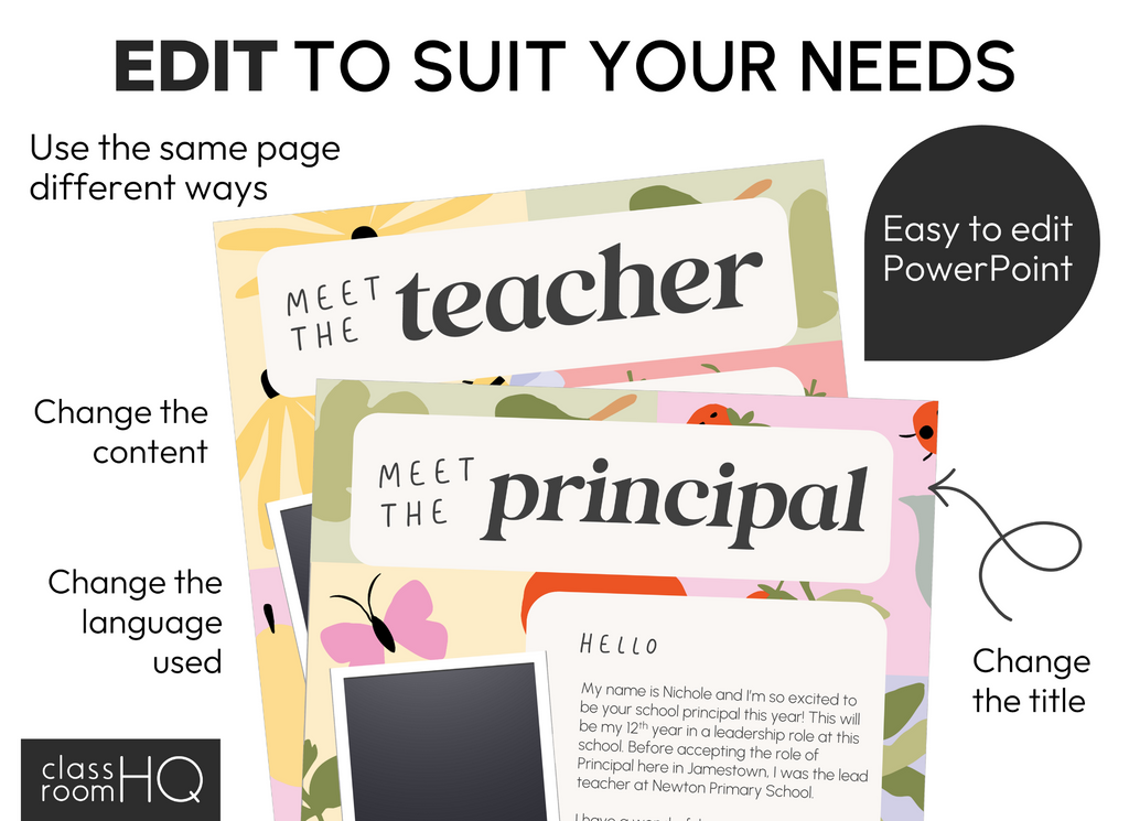 - Space for teacher photo, class info, contact details, classroom routines, key dates & more