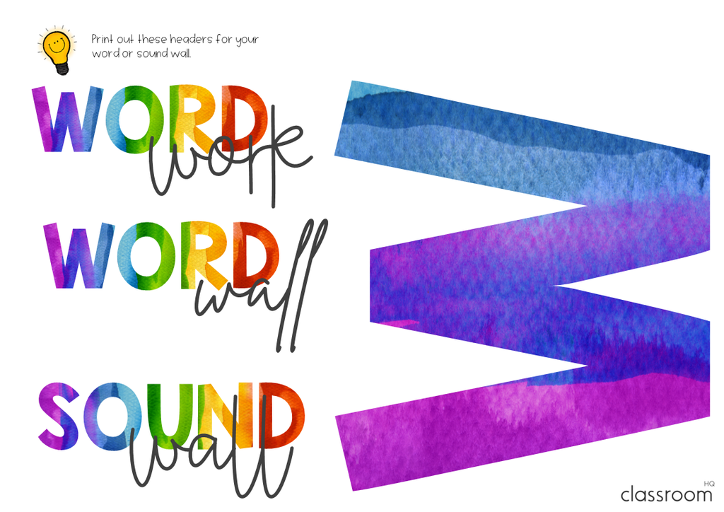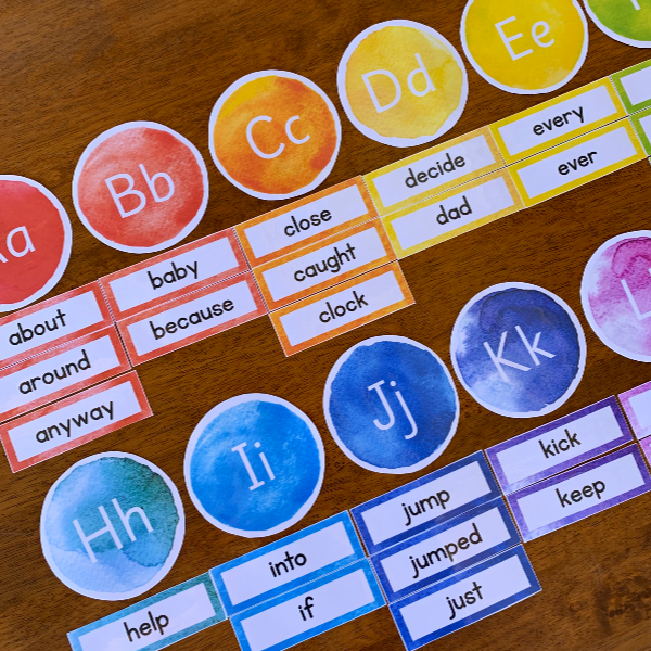 Editable A–Z Word Wall Headers (rainbow watercolor designs in both round + square shapes)