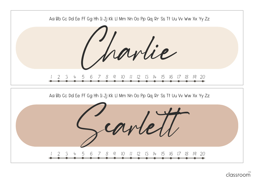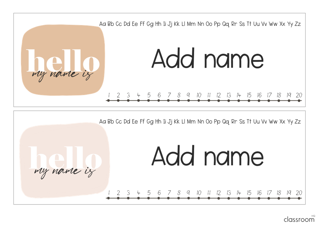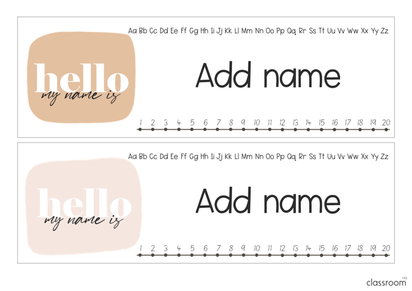 • different Desk Plates with neutral modern boho themed art work + editable text box + number line and alphabet -upper+lowercase letters - 2 to an A4 page (can be resized)