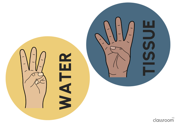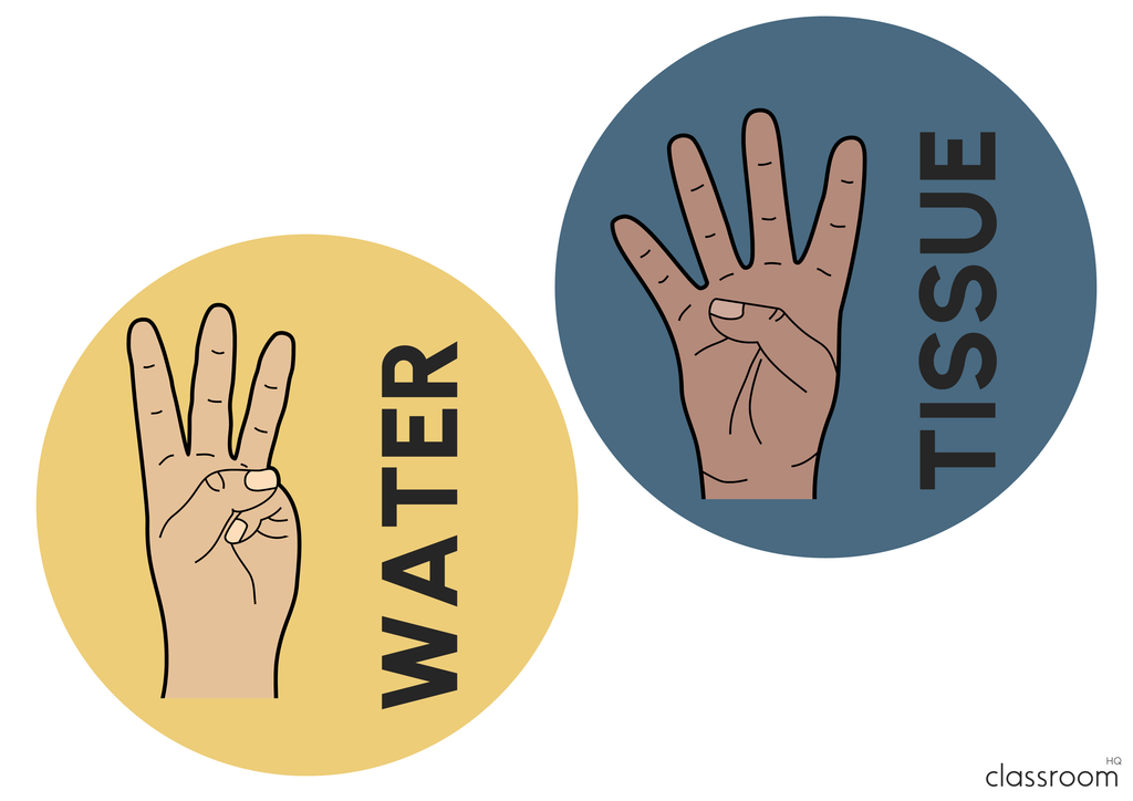 Multiple skin colour options for each signal as well as clip art images for tissues, water bottle have been included plus two different hand signal for toilet.