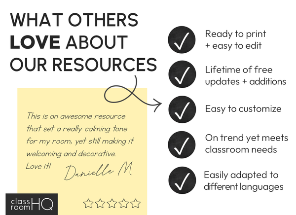 Our editable files allow you to change and customize the text so you can make it exactly what you want to fit your classroom. Simply type into the text boxes provided or add in your own to edit. You will need access to Microsoft PowerPoint to do this.