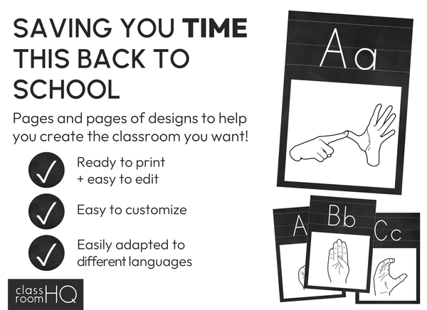 • Aa-Zz American Sign Language (ASL) Alphabet Posters - full page design (black chalkboard frame) - 1 per A4 page
