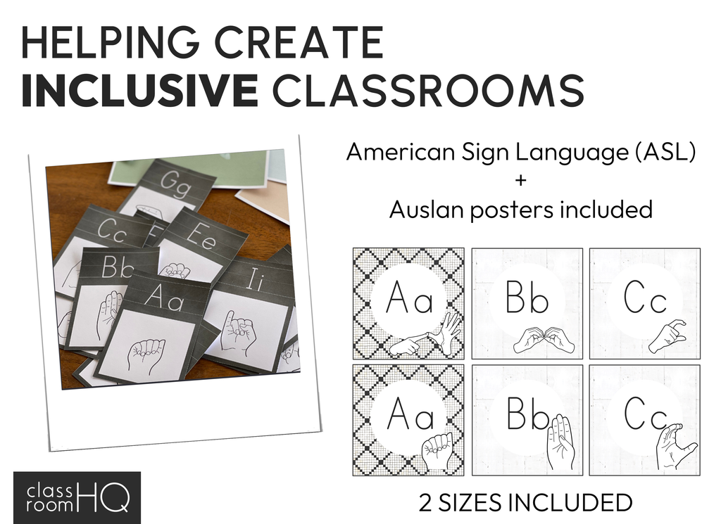 • Aa-Zz American Sign Language (ASL) Alphabet Posters - square design (white tin background - consonants + black and white tile background - vowels) - 1 per A4 page