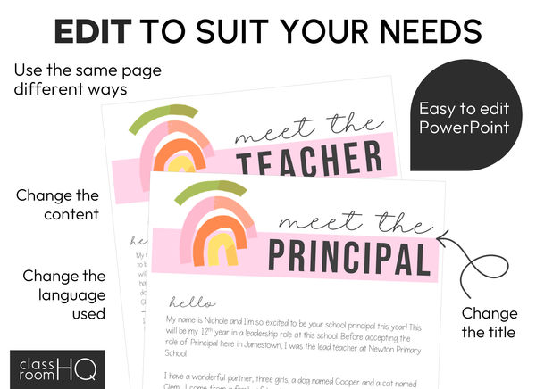 Our editable files allow you to change and customize the text so you can make it exactly what you want to fit your classroom. Simply type into the text boxes provided or add in your own to edit. You will need access to Microsoft PowerPoint to do this.