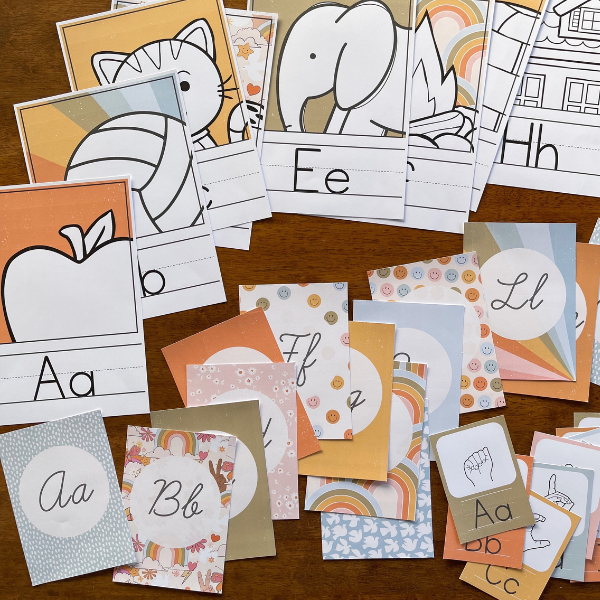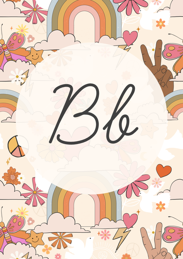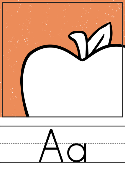 A-Z editable posters portrait design (editable text) featuring featuring mostly white background + a mix of different rainbow colors/patterns + clip art image starting with the same sound - 1 per A4 page