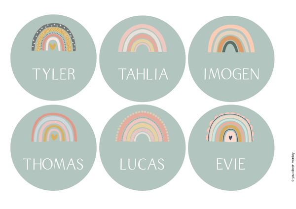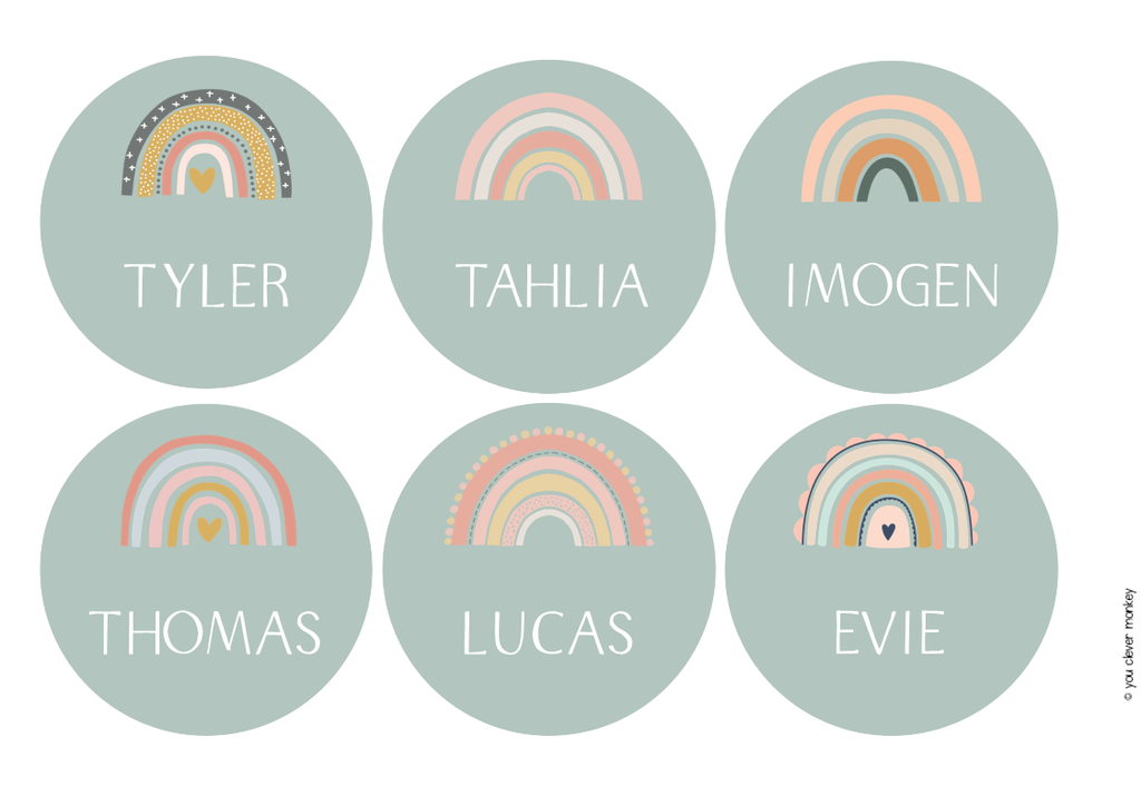 • 36 different coloured small circular labels with modern rainbow artwork - 6 to a page with editable text boxes + can be resized (PowerPoint)