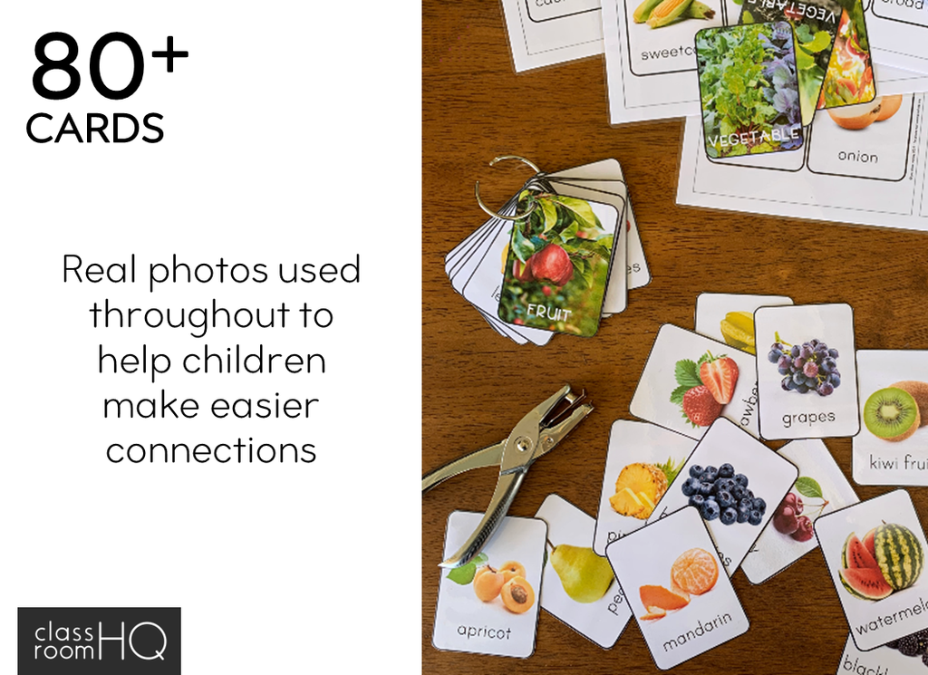 Featuring over gorgeous real life photo cards of 80 of the most commonly found fruit and vegetables, use these cards to create a vocabulary rich environment, print out two sets to play memory with or create a smaller version to use shopping or to create a print rich play center.