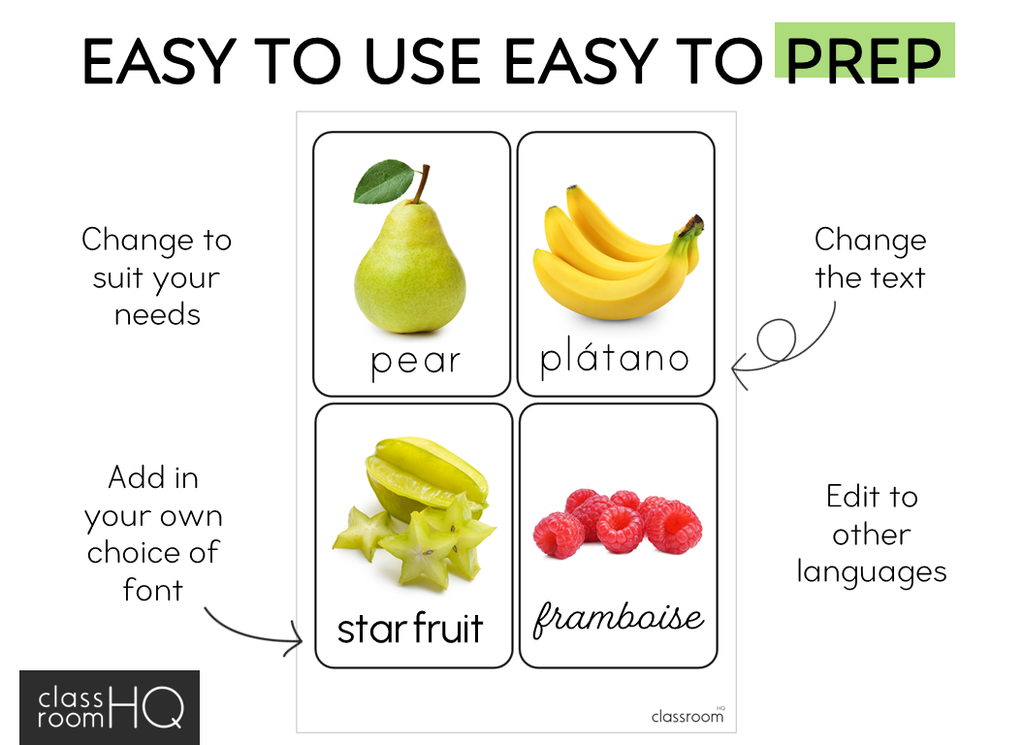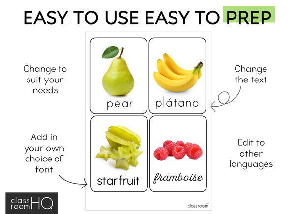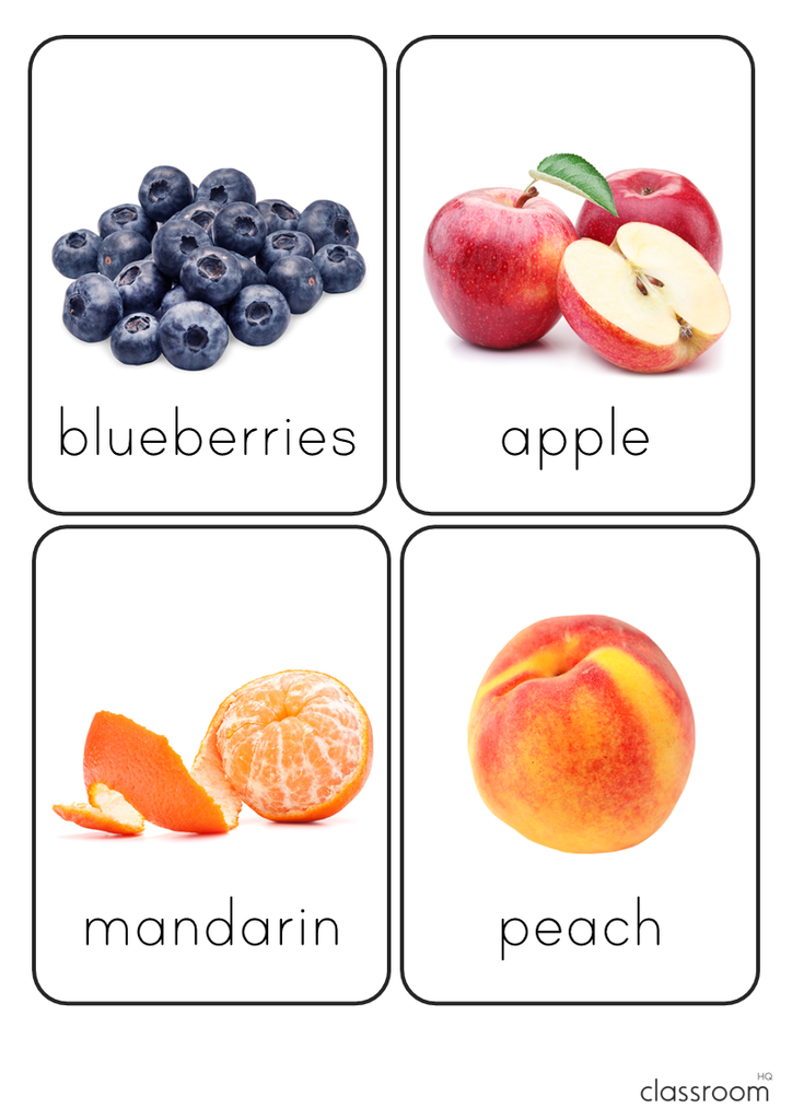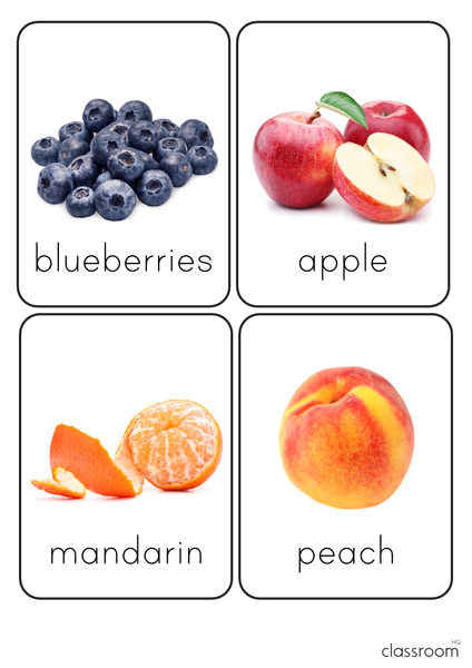 • 40 different fruit cards with real life photos used each with editable text box - 4 per A4 page