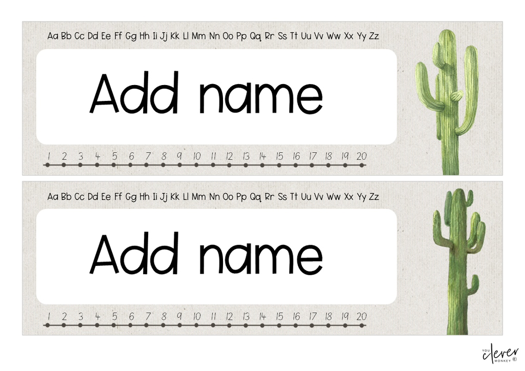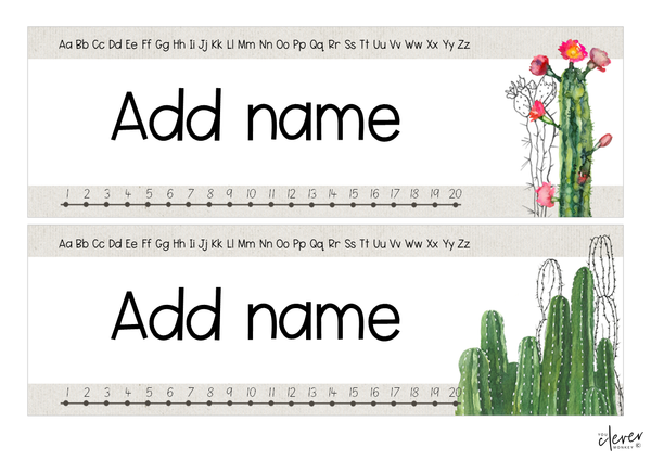 • 36 different Desk Plates with cactus + succulent themed art work + + editable text box + editable alphabet line + editable number line 0-20 - 2 per A4 page