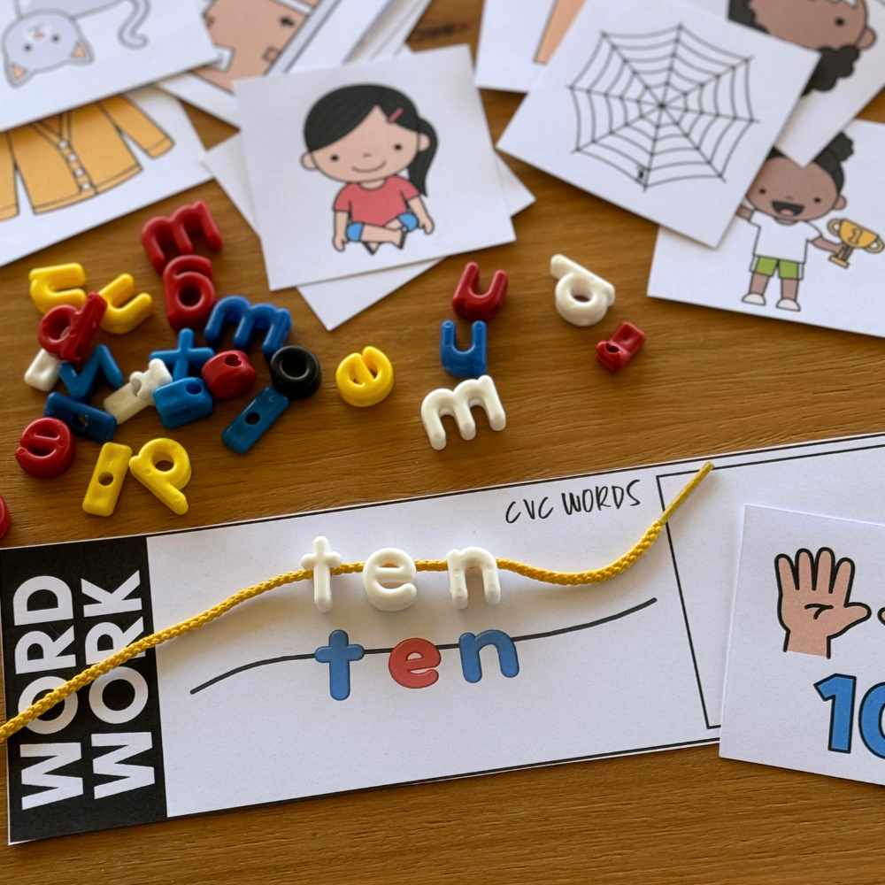 • CVC Word Cards (120 different words): Bright, easy-to-read cards featuring common CVC words for practice spelling and reading.