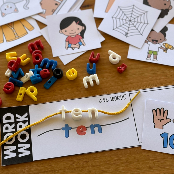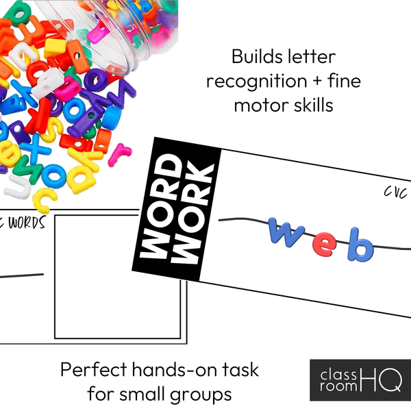 Your students will build confidence as they sort and find the matching alphabet lacing beads to spell simple CVC words and then read the word to be able to correctly match the corresponding picture cards in a supportive, small-group setting.